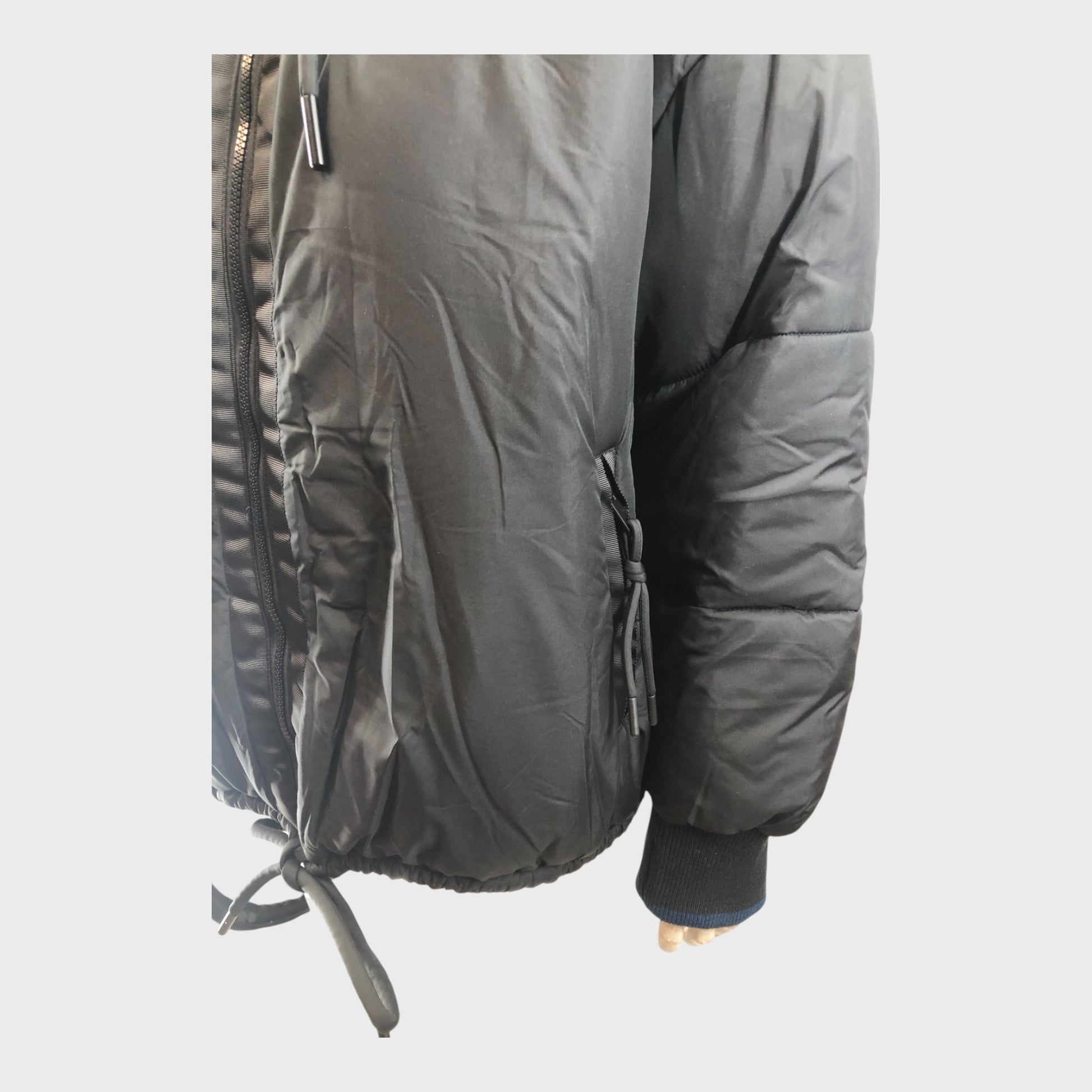 This black women's bomber jacket in UK size 12 is designed with extended tassels at the neck and waist, offering both style and added warmth ideal for cooler conditions.