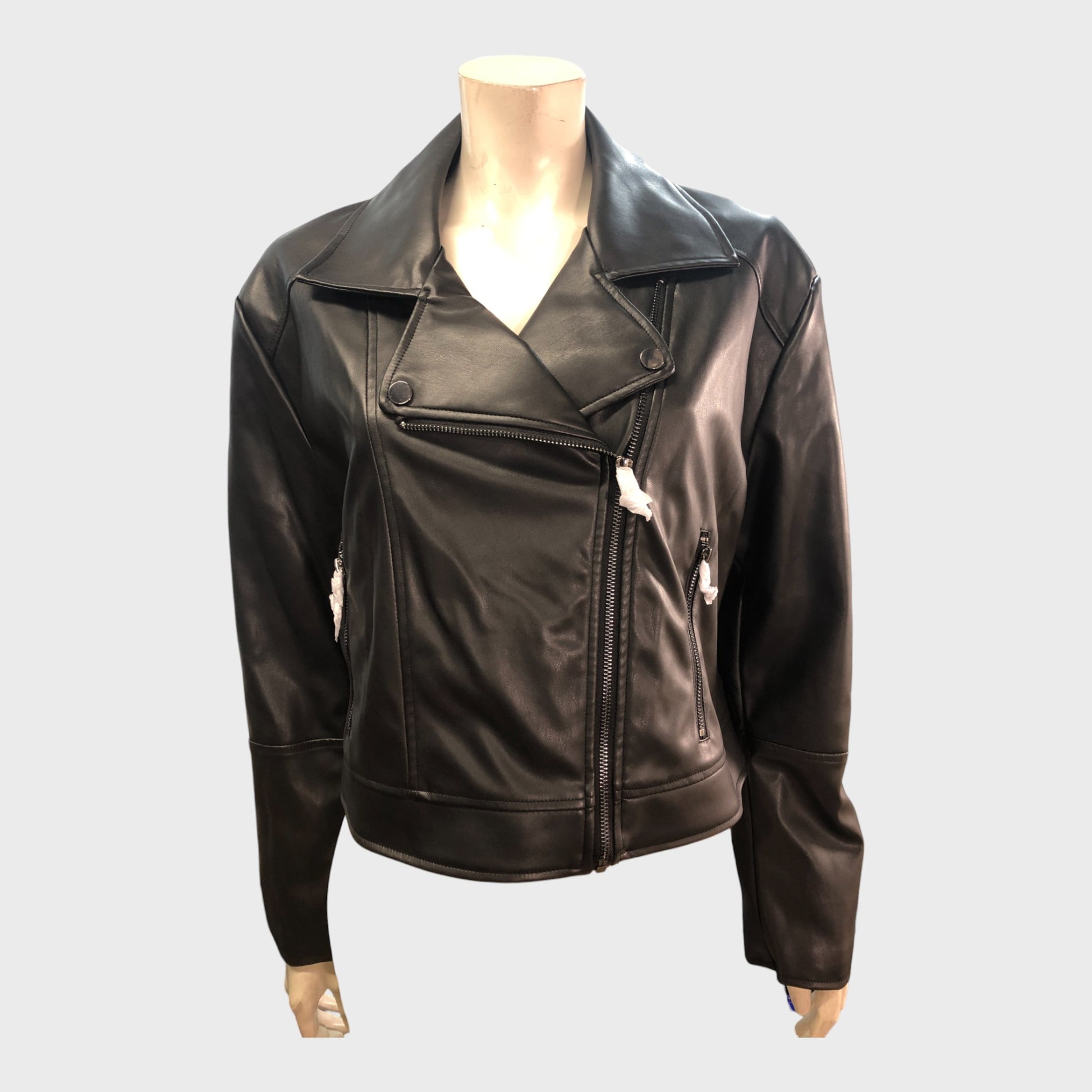 This women's biker jacket features a faux leather finish, equipped with two zippered pockets and zippered cuffs for a sleek, functional design.