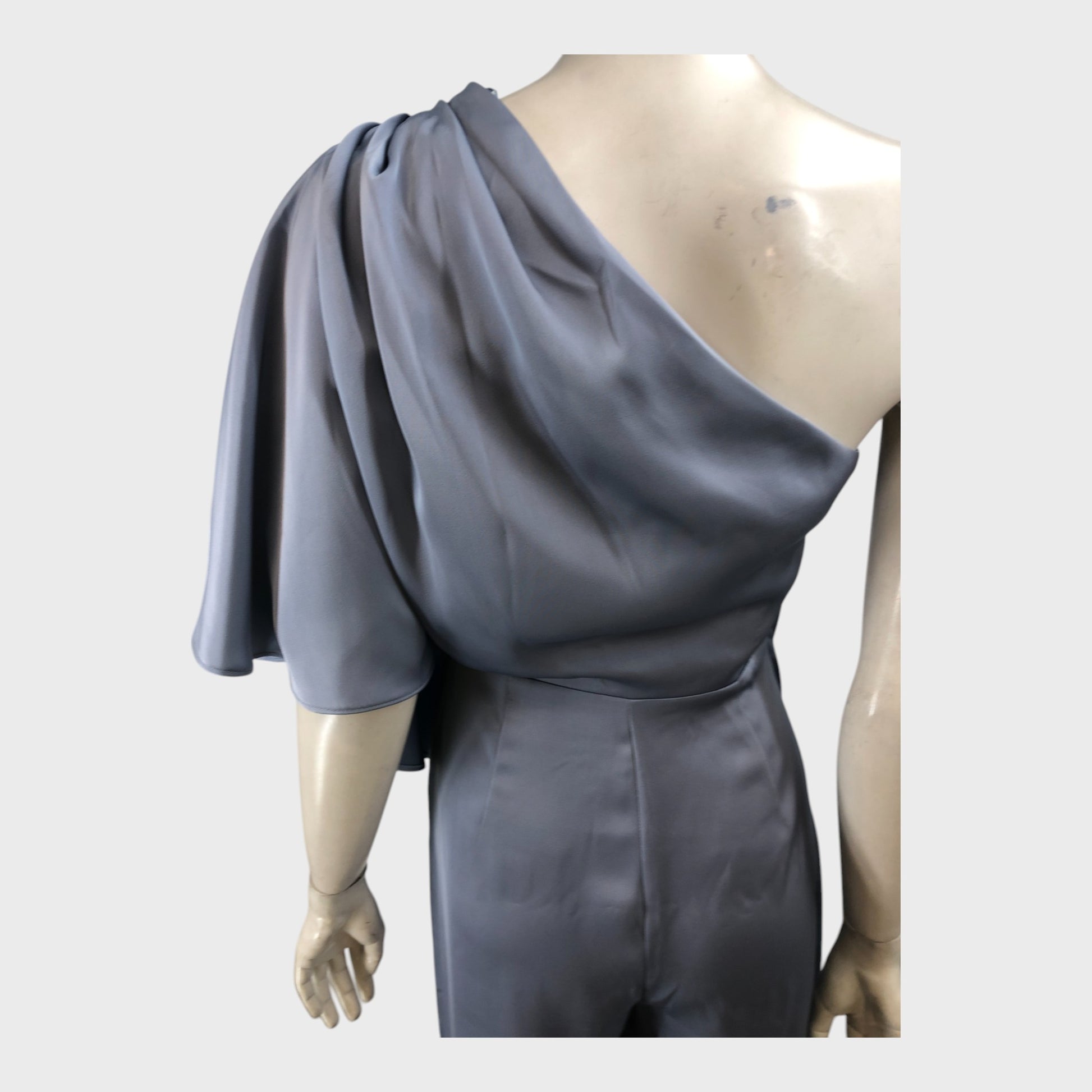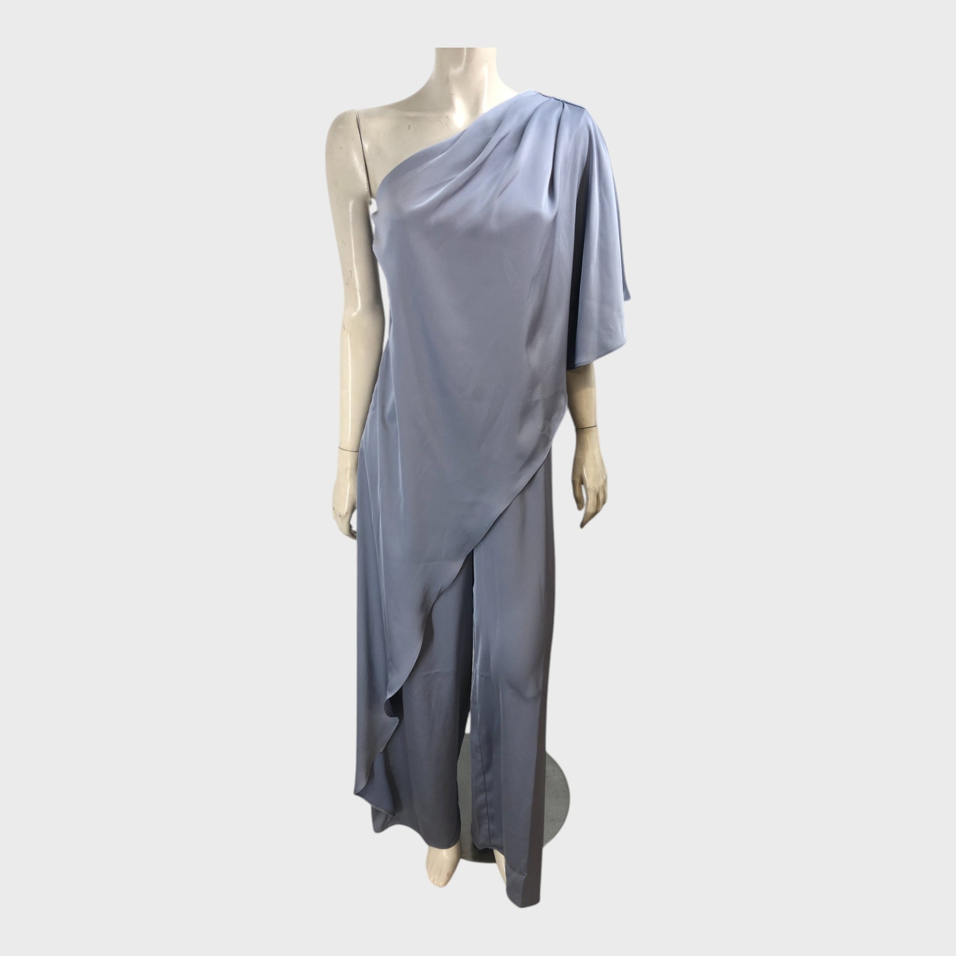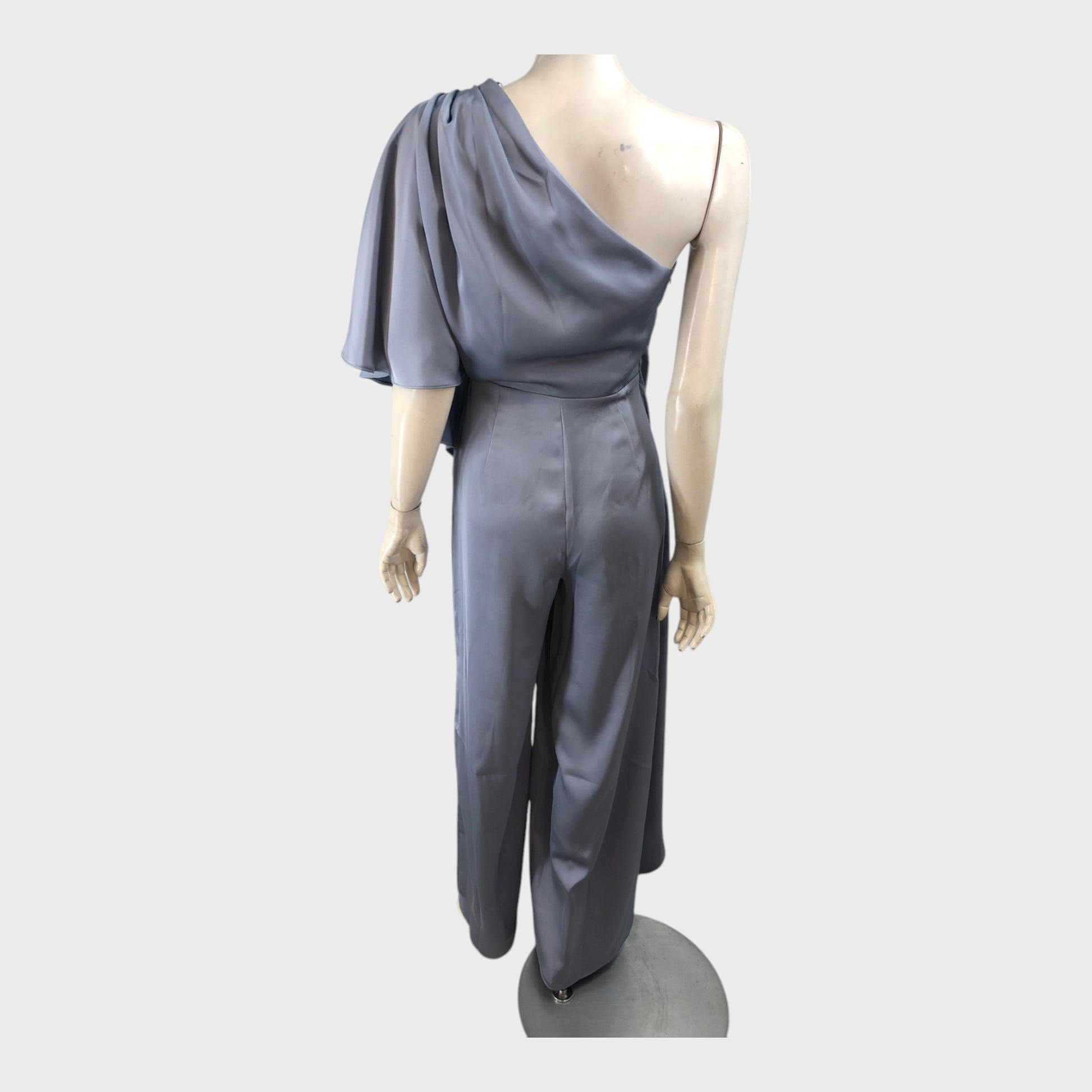 Enhance your wardrobe with this elegant Blue Draped Jumpsuit. Made with a one shoulder design and side zip closure, this jumpsuit is expertly crafted to provide a sleek and flattering silhouette. The wide leg design adds a touch of sophistication, making it the perfect option for any occasion.