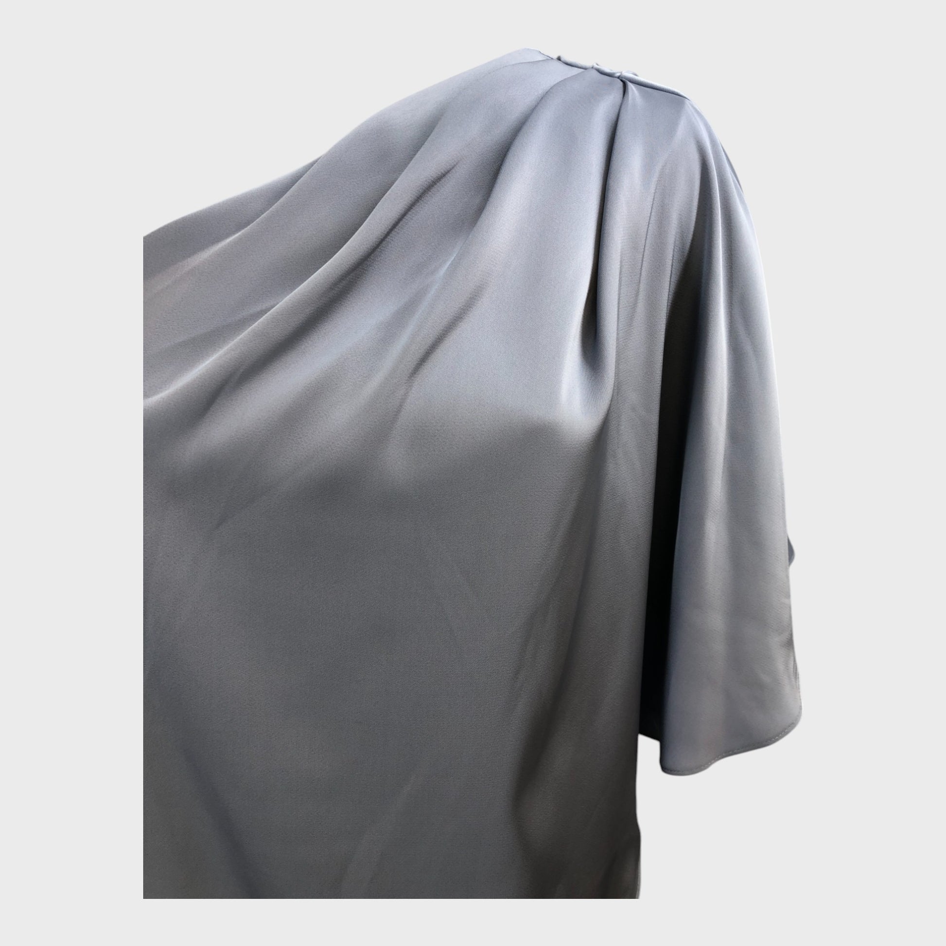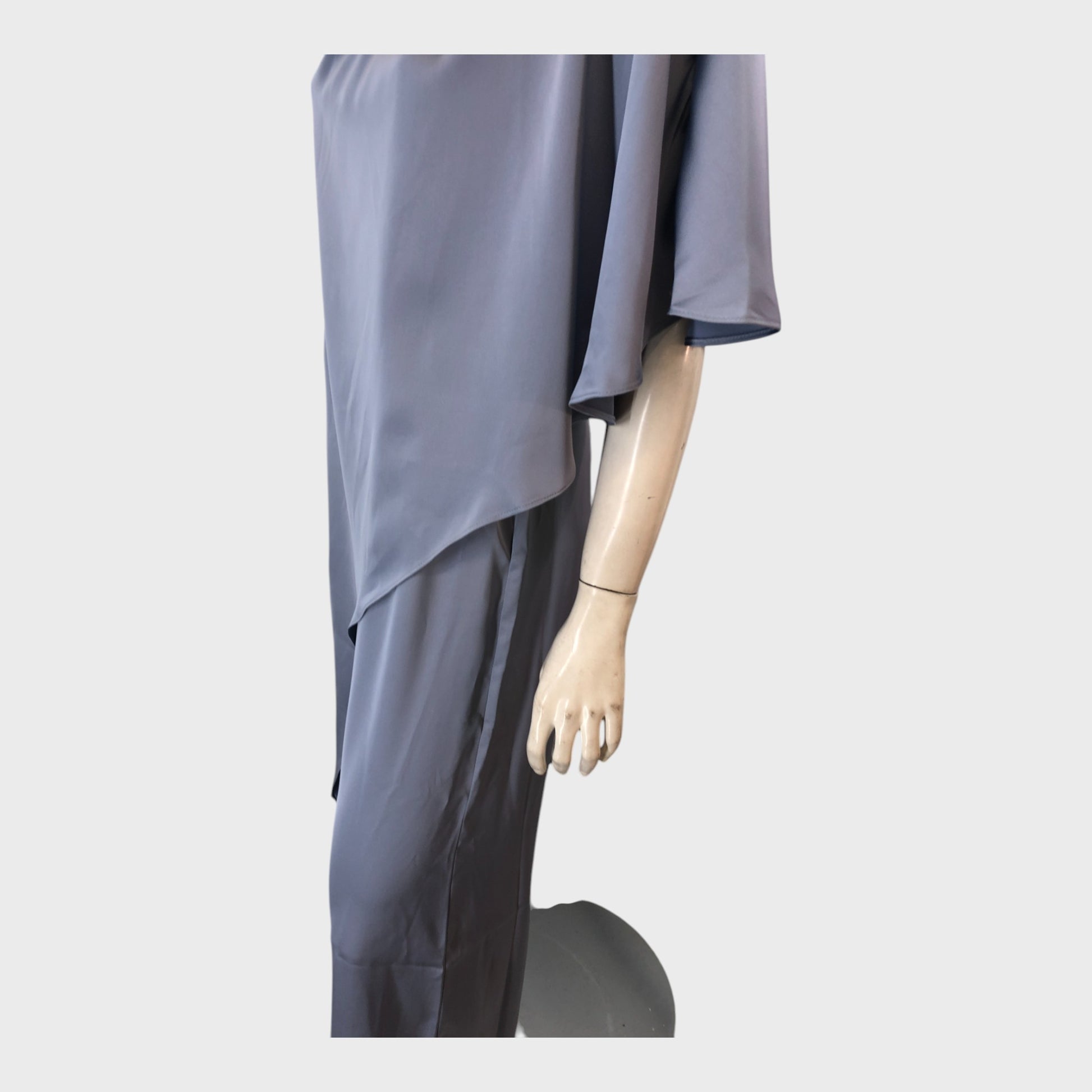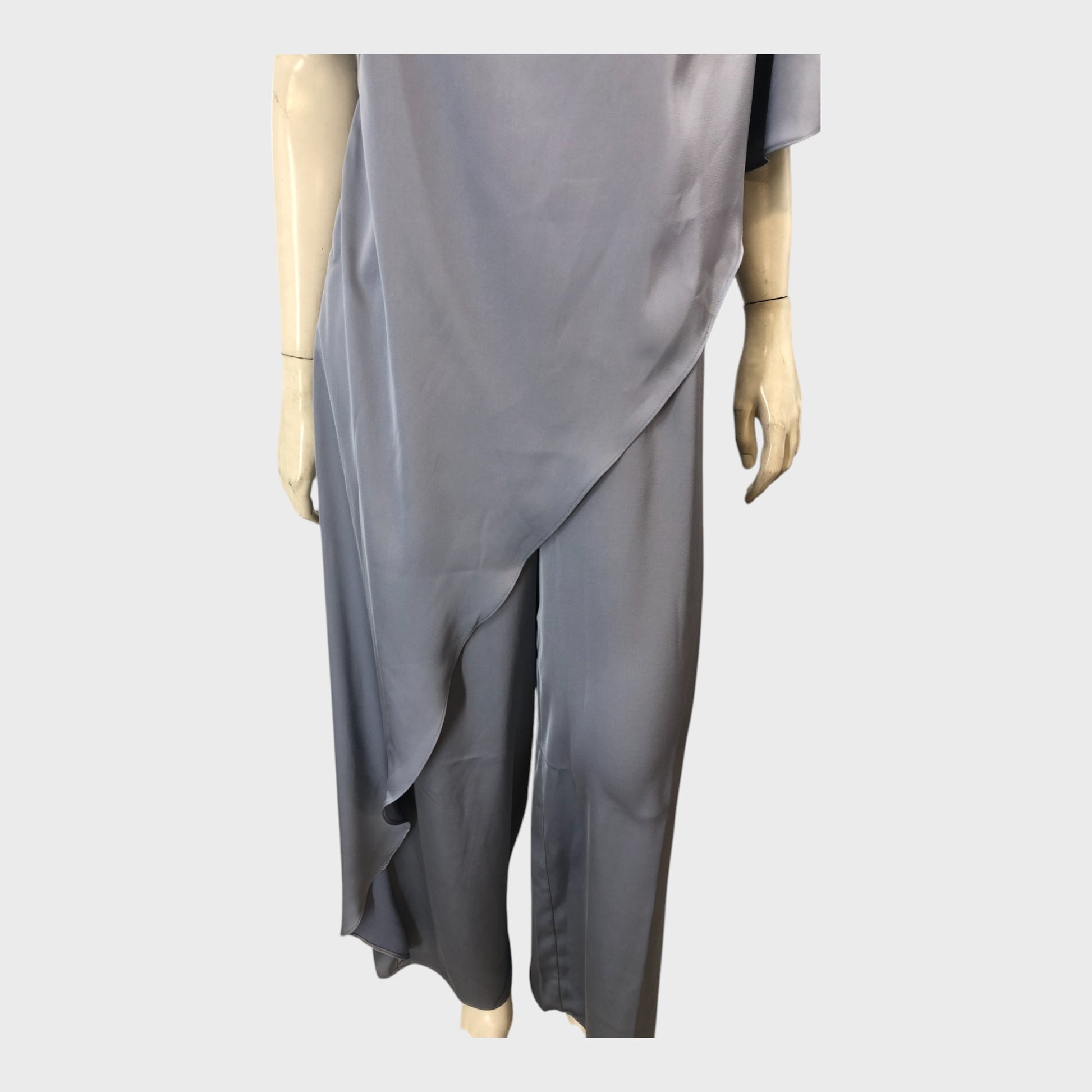 Enhance your wardrobe with this elegant Blue Draped Jumpsuit. Made with a one shoulder design and side zip closure, this jumpsuit is expertly crafted to provide a sleek and flattering silhouette. The wide leg design adds a touch of sophistication, making it the perfect option for any occasion.