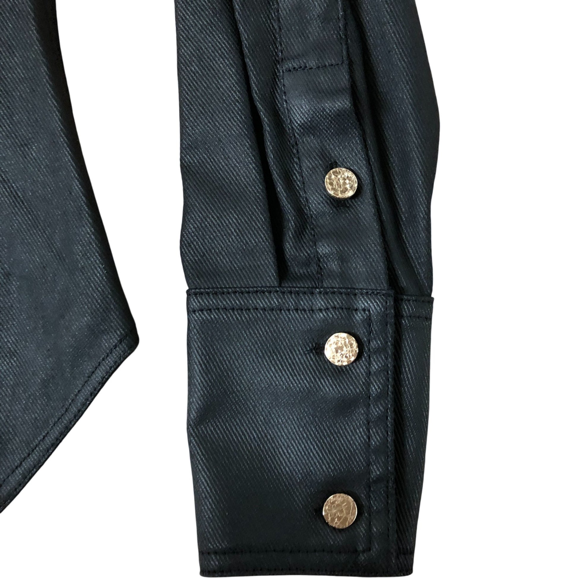 - Buttons: Gold-tone button closure