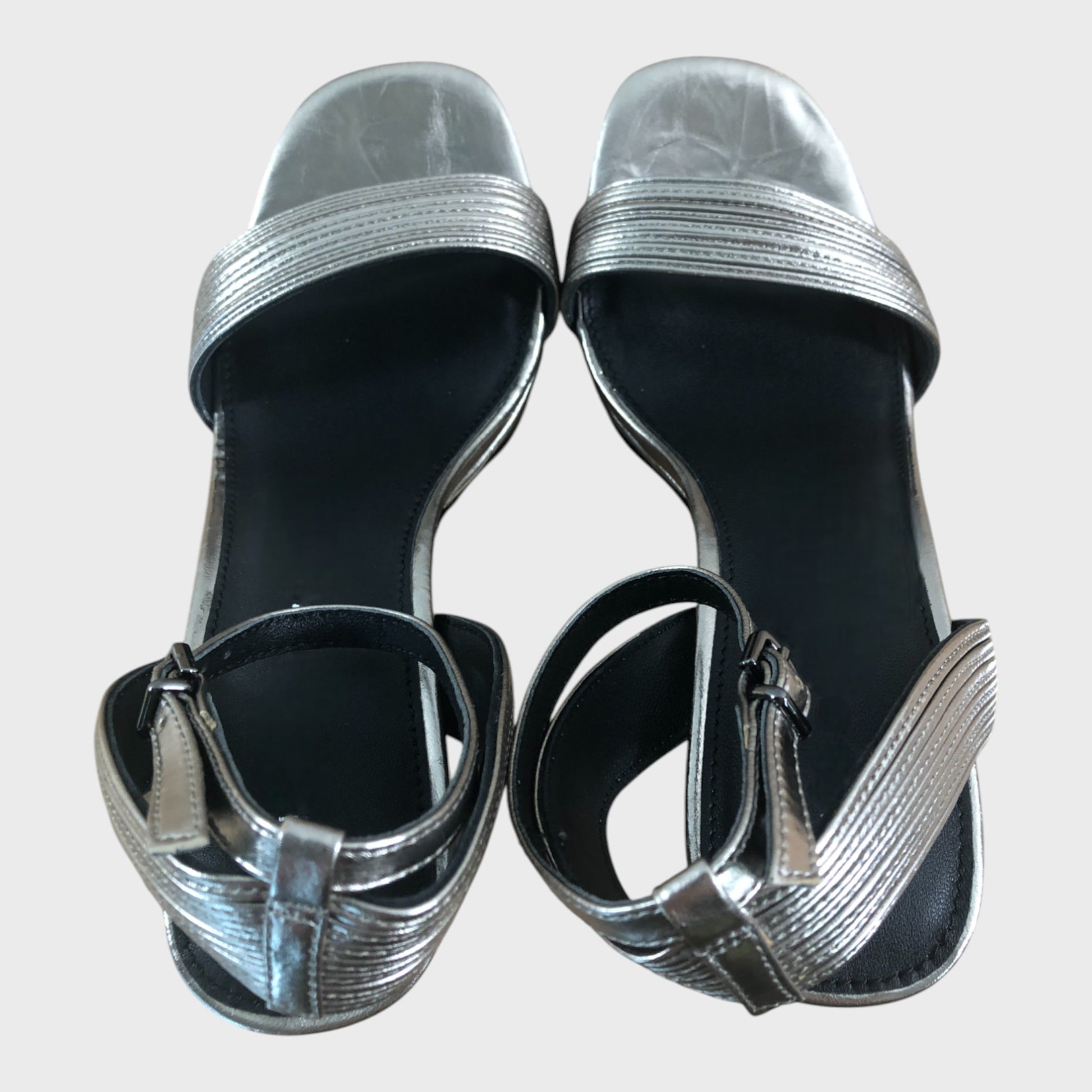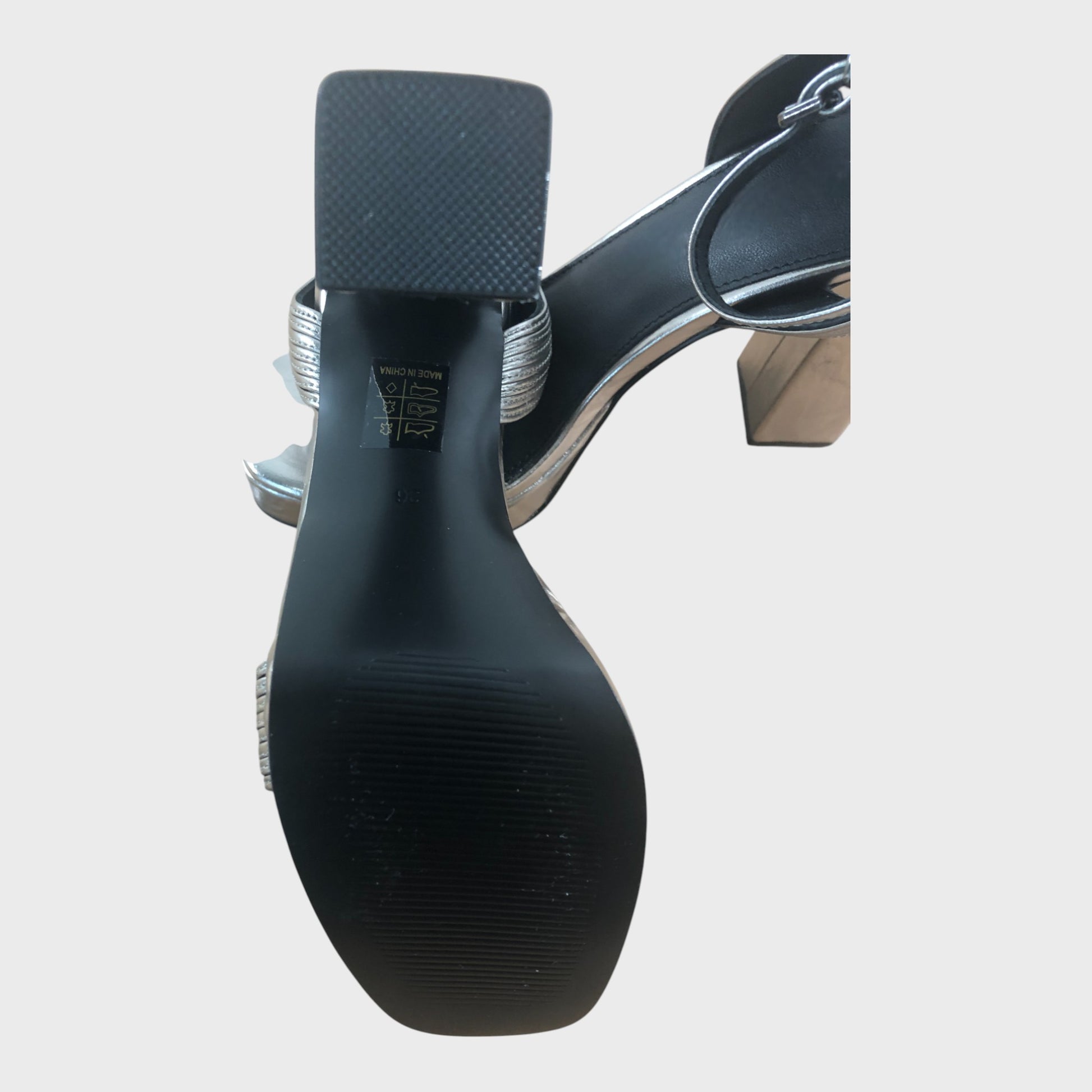 These branded metallic platform sandals for women showcase a secure strap closure and a sturdy block heel, making them an excellent choice for parties or evening occasions.