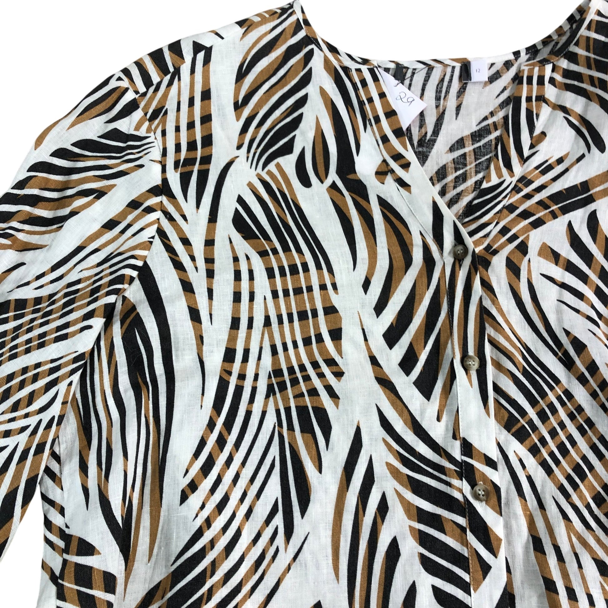 Branded Stylish Linen Blouse UK12 Women's White Brown Printed Long Sleeve Top
