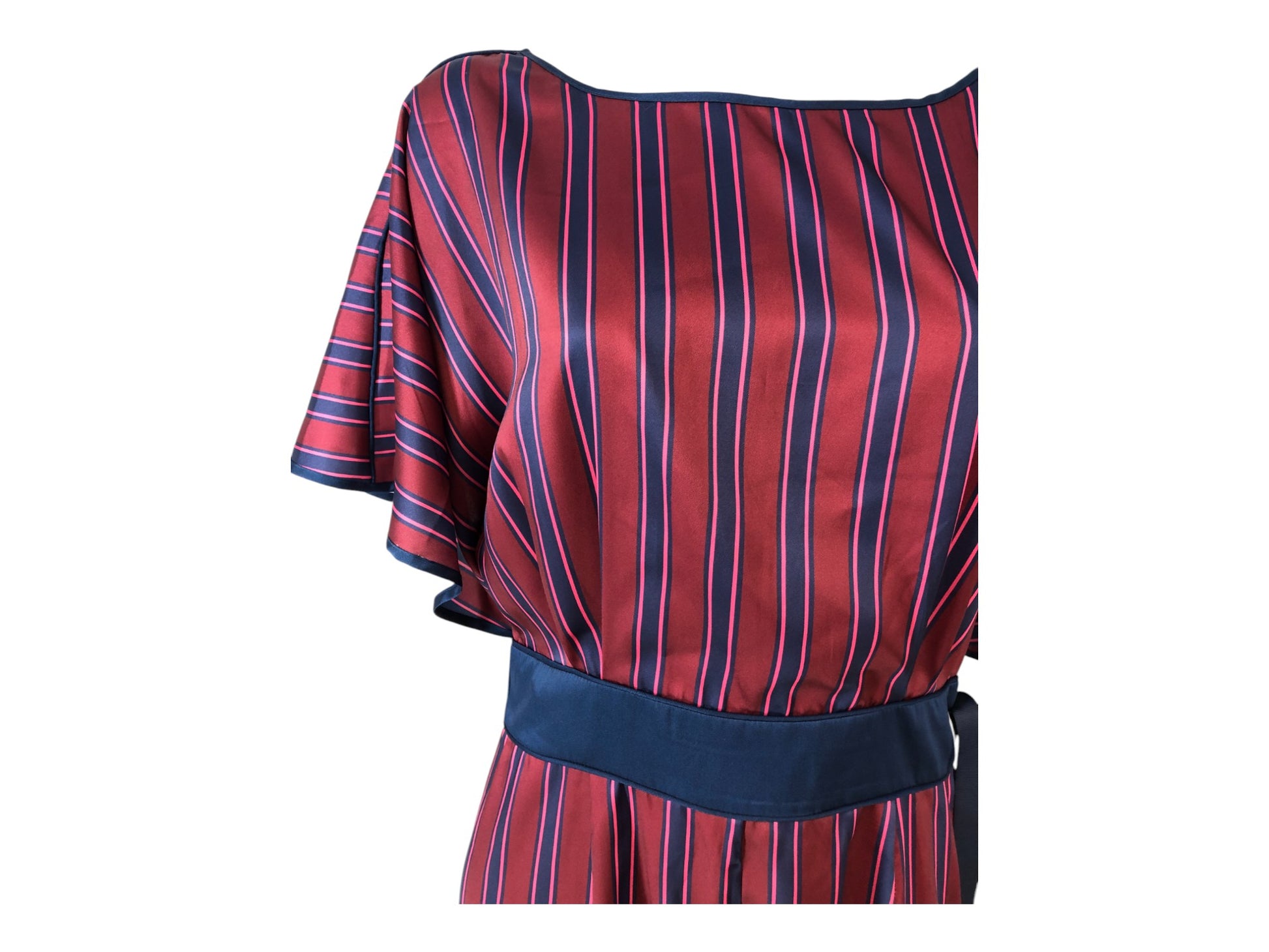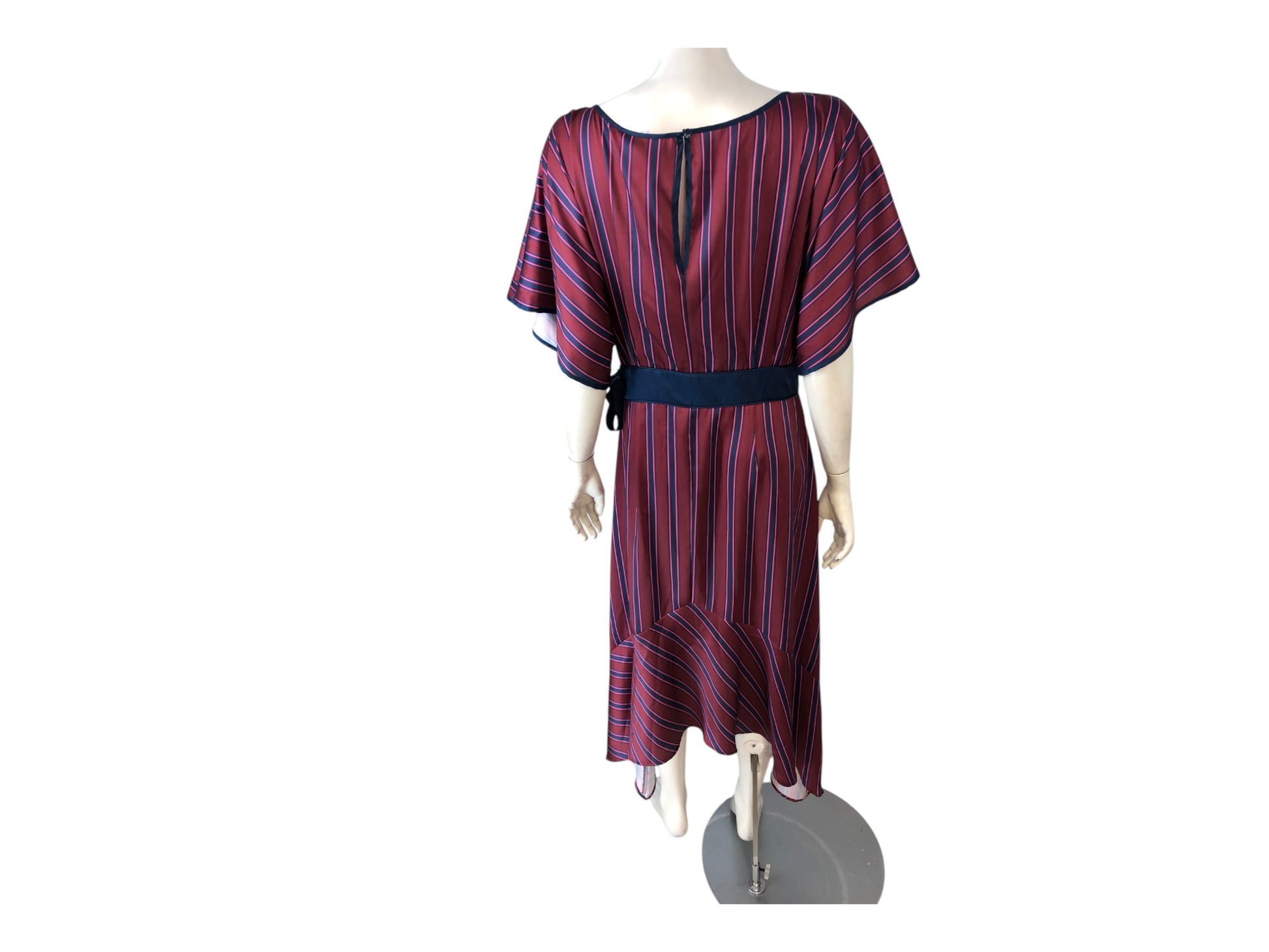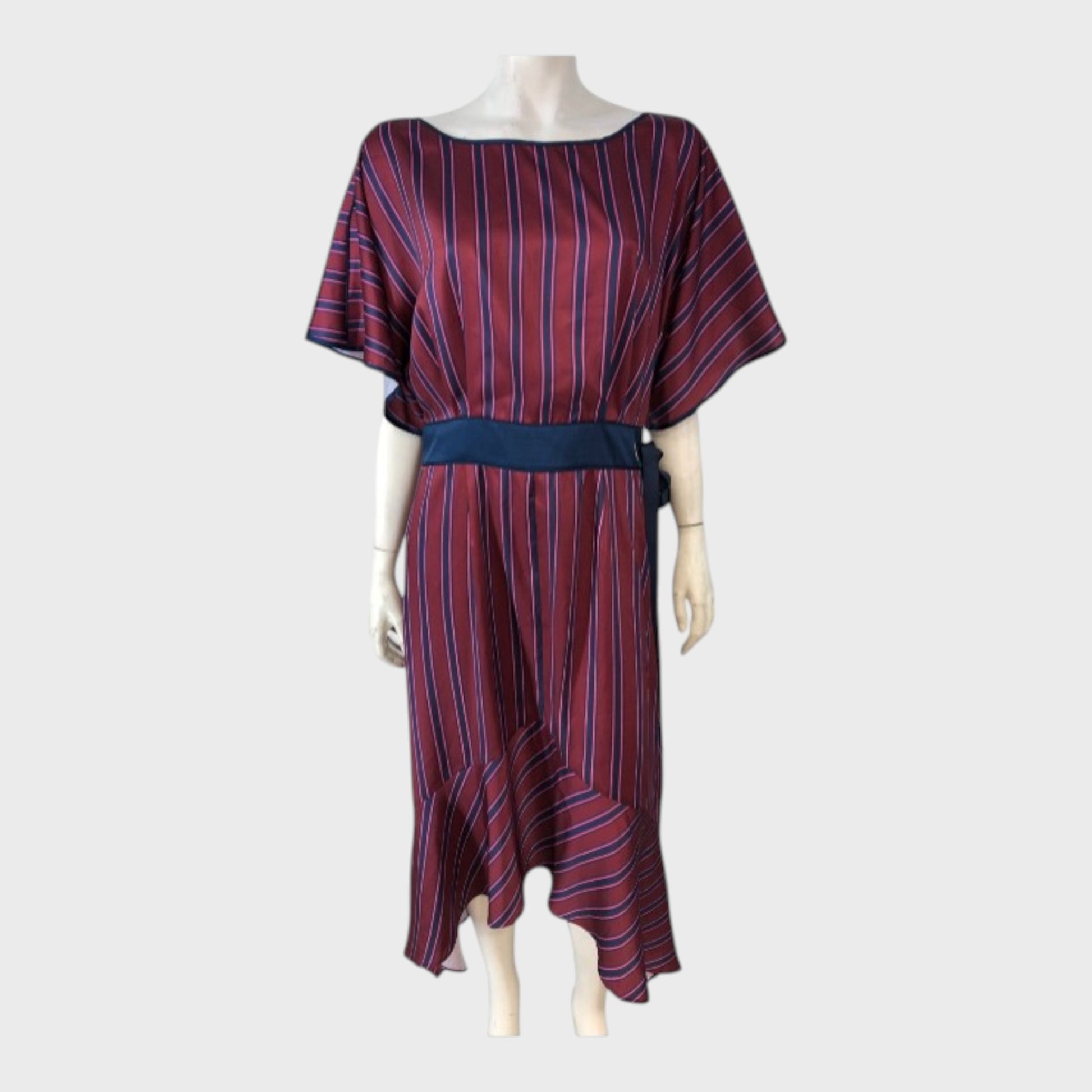 Burgundy blue striped satin midi dress with kimono style sleeves, a high low tiered hem, eyelet and ribbon detailing at waist and side zip fastening.