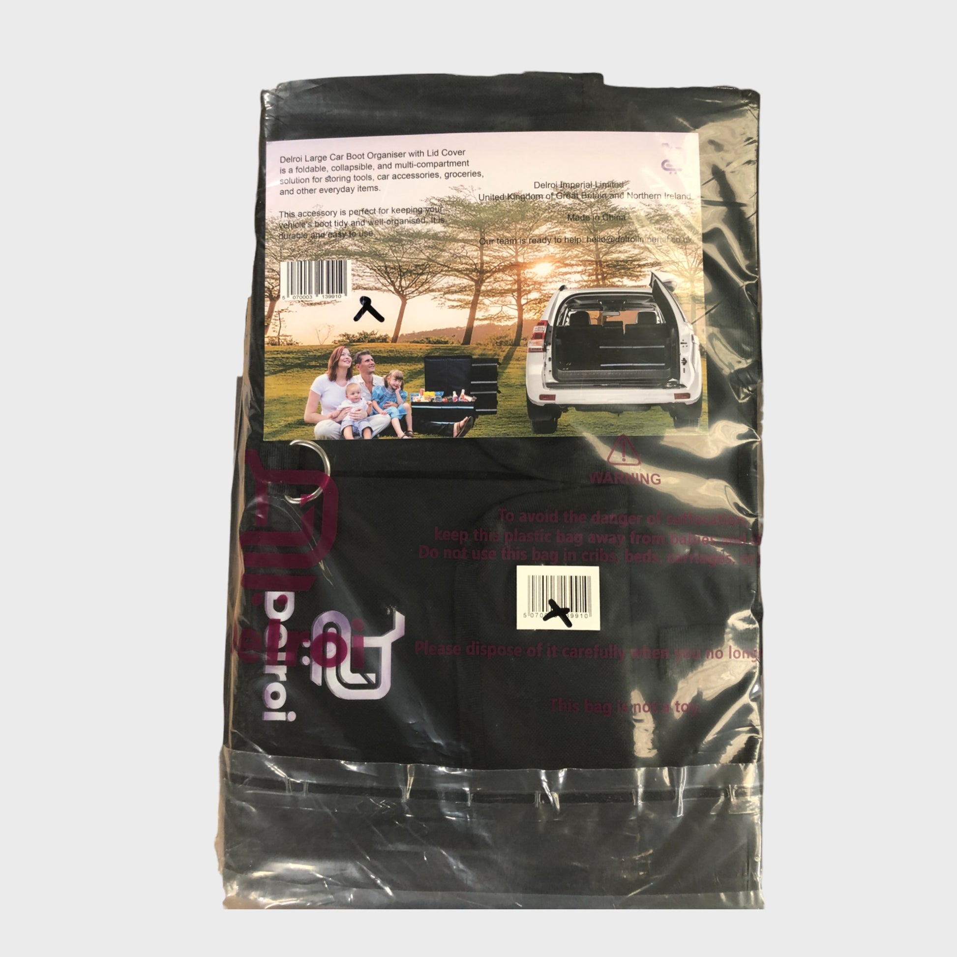 The DELROI Large Car Boot Organiser in black is a versatile storage solution designed to keep your vehicle tidy. Made from durable nylon and featuring a collapsible design, it offers adjustable capacity to suit your needs. Its self-adhesive attachment ensures secure placement in your car boot, while the lid cover protects contents from dust and spills.