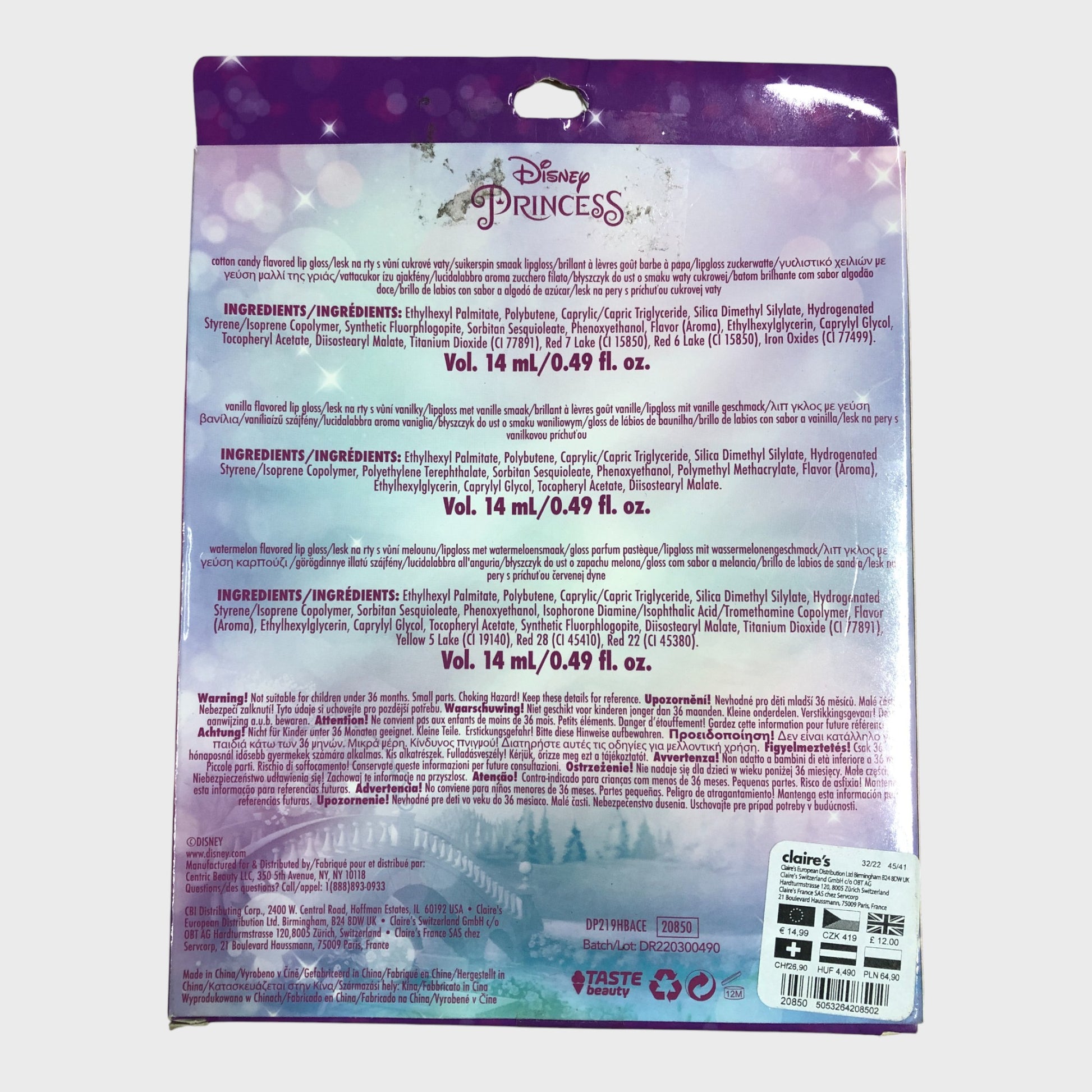 This delightful Disney Princess lip gloss collection features three distinct flavours—Candy, Vanilla, and Watermelon—each delivering 14 ml of glossy colour and shine.
