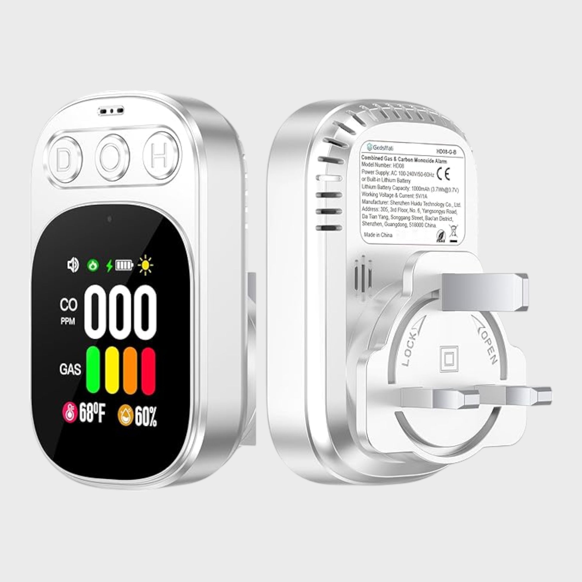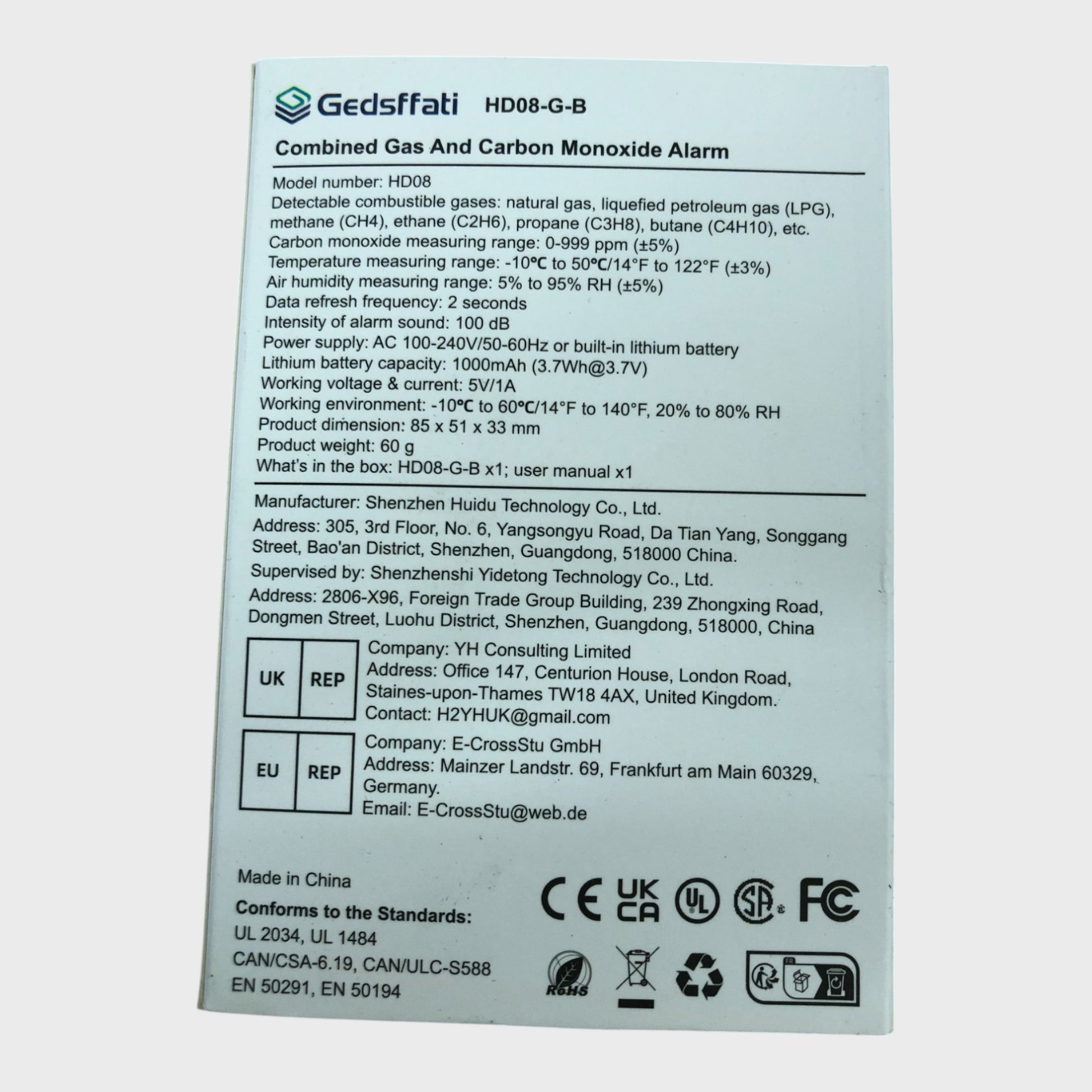 The GEDSFFATI HD08-G-B is a professional-grade smoke and carbon monoxide detector designed to identify natural gas, LPG, methane, ethane, propane, and butane. It monitors carbon monoxide levels from 0 to 999 ppm, operating reliably between -10°C and 50°C with 5% to 95% humidity. Equipped with a loud 100 dB alarm, it ensures prompt alerts. Powered by AC 100-240V or a 1000mAh lithium battery, it offers flexible and continuous protection for your environment.