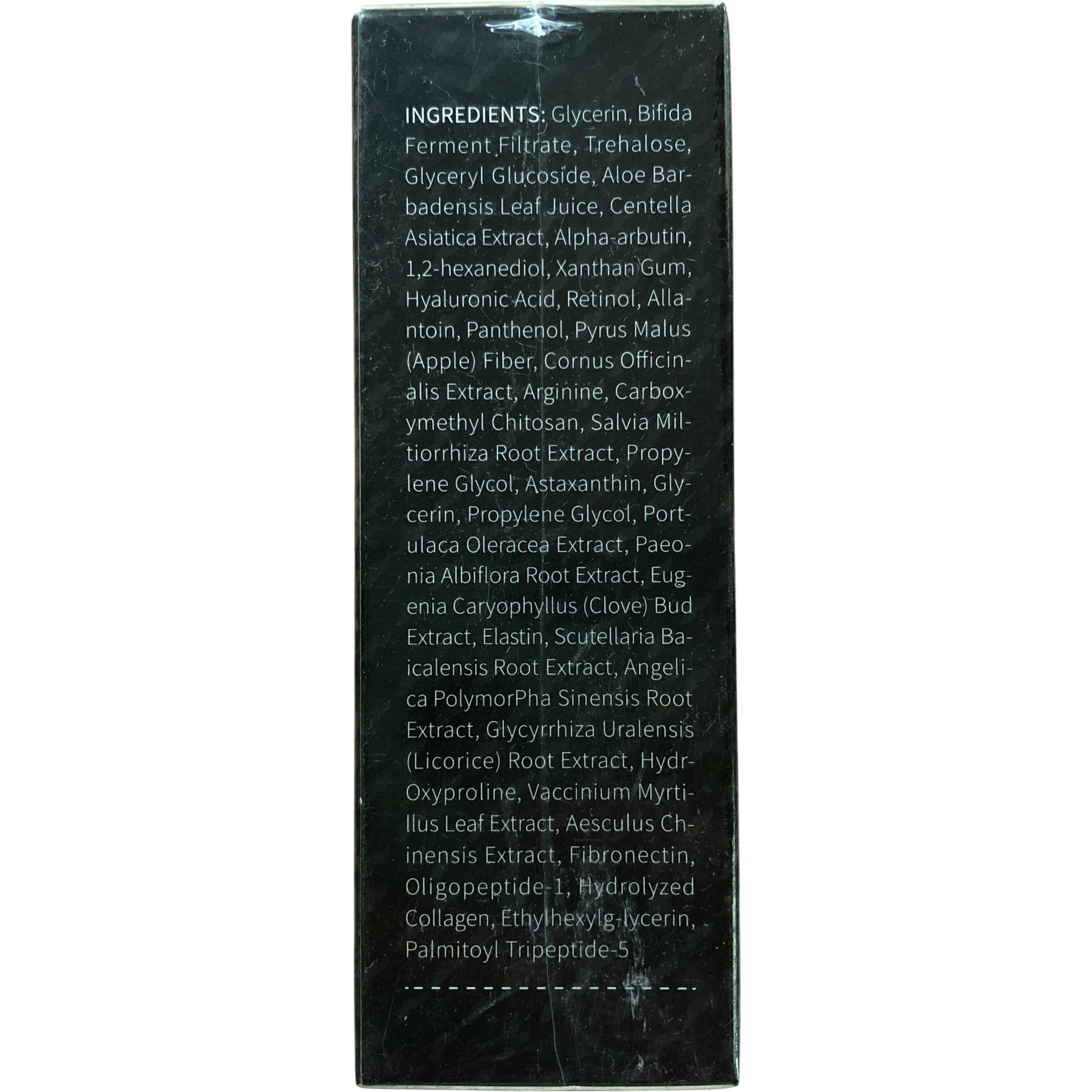 - Ingredient List: Glycerin, Bifida Ferment Filtrate, Trehalose, Glyceryl Glucoside, Aloe Barbadensis Leaf Juice, Centella Asiatica Extract, Alpha-arbutin, 1,2-hexanediol, Xanthan Gum, Hyaluronic Acid, Retinol, Allantoin, Panthenol, Pyrus Malus (Apple) Fiber, Cornus Officinalis Extract, Arginine, Carboxymethyl Chitosan, Salvia Miltiorrhiza Root Extract, Propylene Glycol, Astaxanthin, Glycerin, Propylene Glycol, Portulaca Oleracea Extract, Paeonia Albiflora Root Extract, Eugenia Caryophyllus (Clove) Bud Extract, Elastin, Scutellaria Baicalensis Root Extract, Angelica Polymorpha Sinensis Root Extract, Glycyrrhiza Uralensis (Licorice) Root Extract, Hydroxyproline, Vaccinium Myrtillus Leaf Extract, Aesculus Chinensis Extract, Fibronectin, Oligopeptide-1, Hydrolyzed Collagen, Ethylhexylglycerin, Palmitoyl Tripeptide-5