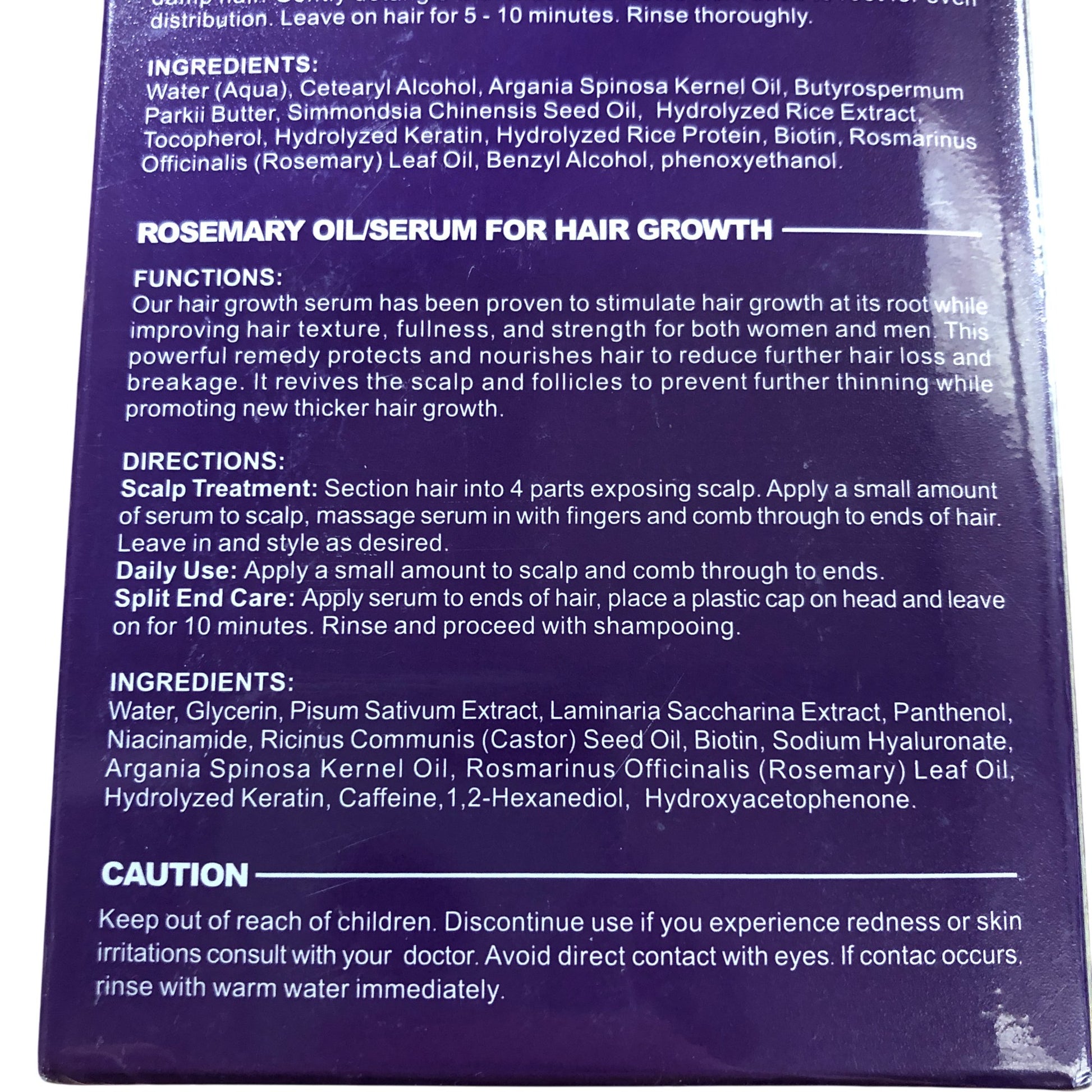 - Ingredients: Biotin, Argan Oil, Rosemary Oil, Castor Oil, Keratin, Caffeine, Rice Extract, Coconut Oil, Rice Protein