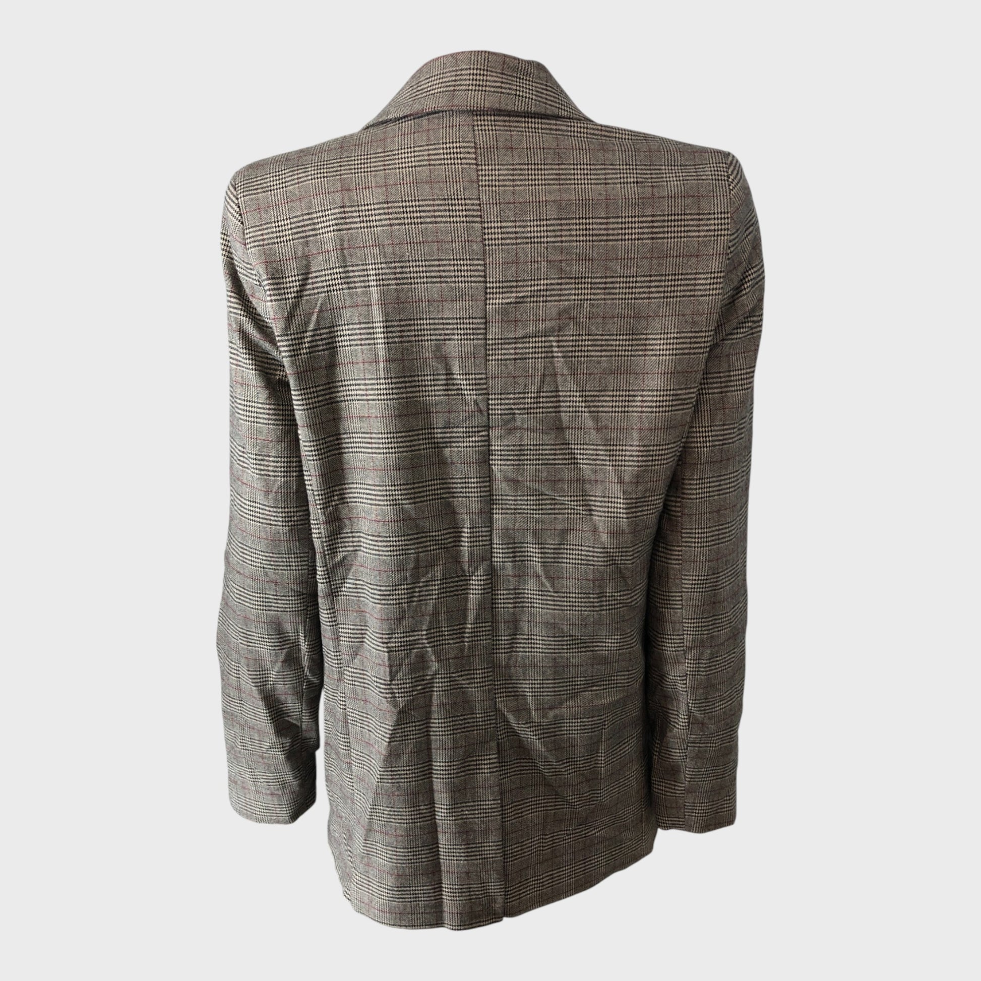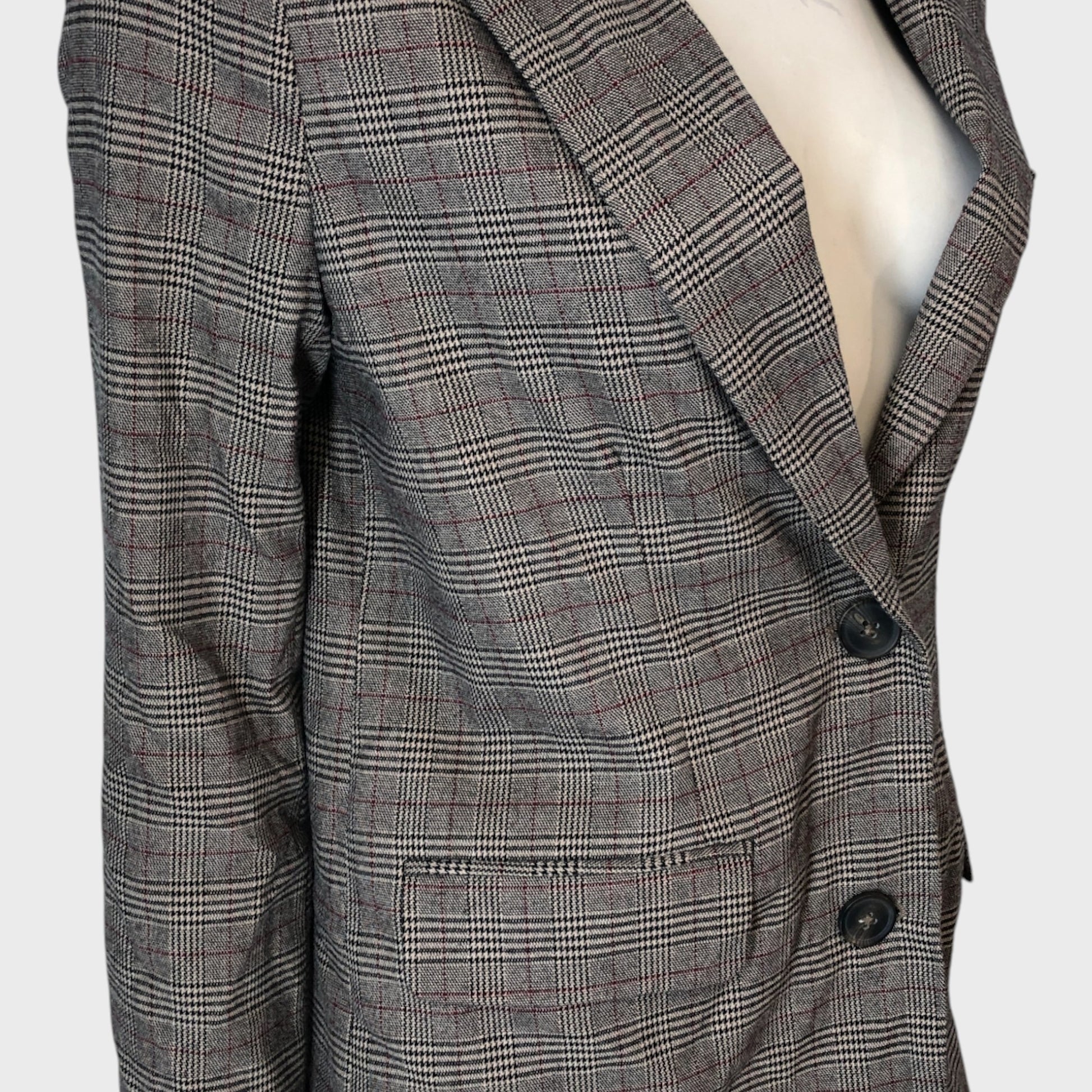 Grey checked blazer with notched lapels, two button fastening, mock chest pocket, two front mock flap pockets and fully lined.