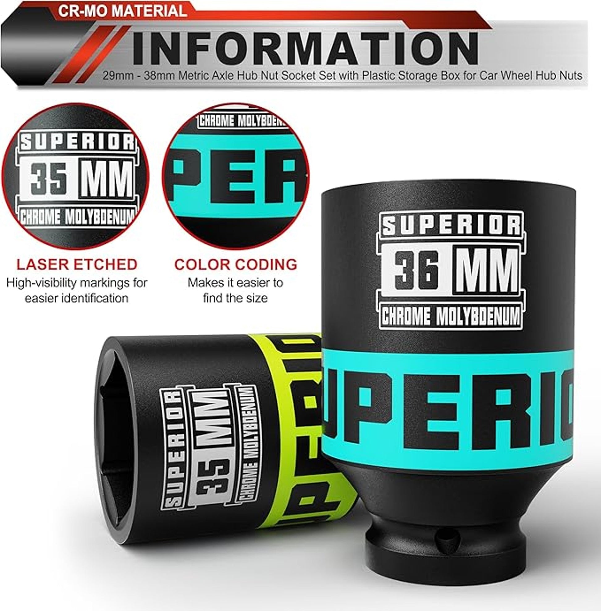 KIRXST 1/2 Inch Impact Socket Set, 29mm - 38mm Metric Axle Hub Nut Socket Set