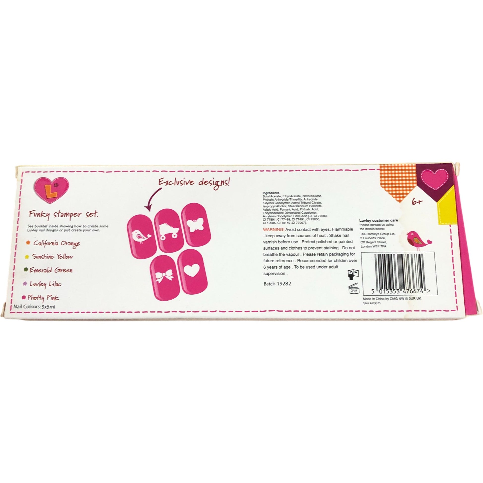 - Nail Colours: 5 x 5ml - California Orange, Sunshine Yellow, Emerald Green, Lovely Lilac, Pretty Pink