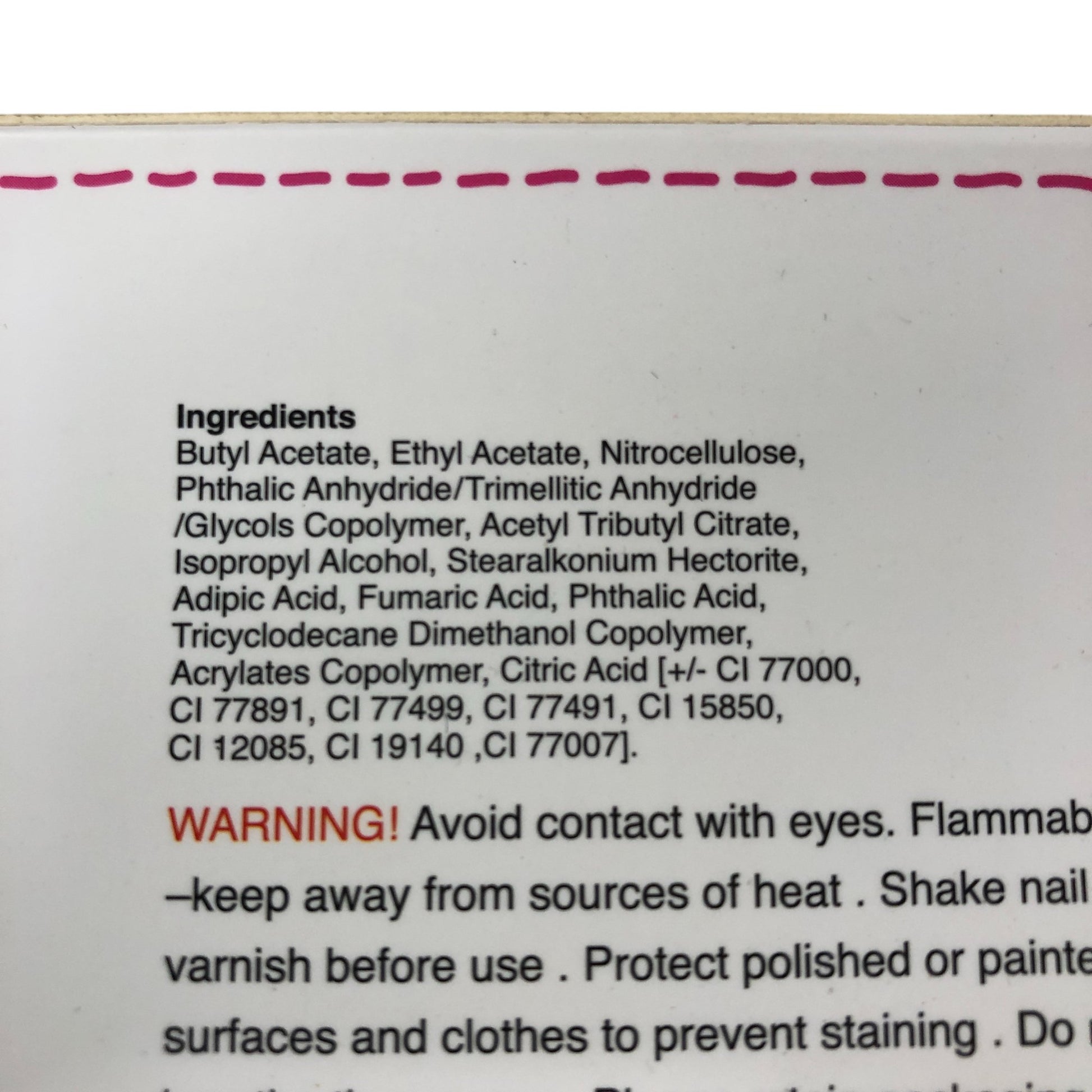 - Ingredients: Butyl Acetate, Ethyl Acetate, Nitrocellulose, Phthalic Anhydride/Trimellitic Anhydride/Glycols Copolymer, Acetyl Tributyl Citrate, Isopropyl Alcohol, Stearalkonium Hectorite, Adipic Acid, Fumaric Acid, Phthalic Acid, Tricyclodecane Dimethanol Copolymer, Acrylates Copolymer, Citric Acid, CI 77000, CI 77891, CI 77499, CI 77491, CI 15850, CI 12085, CI 19140, CI 77007