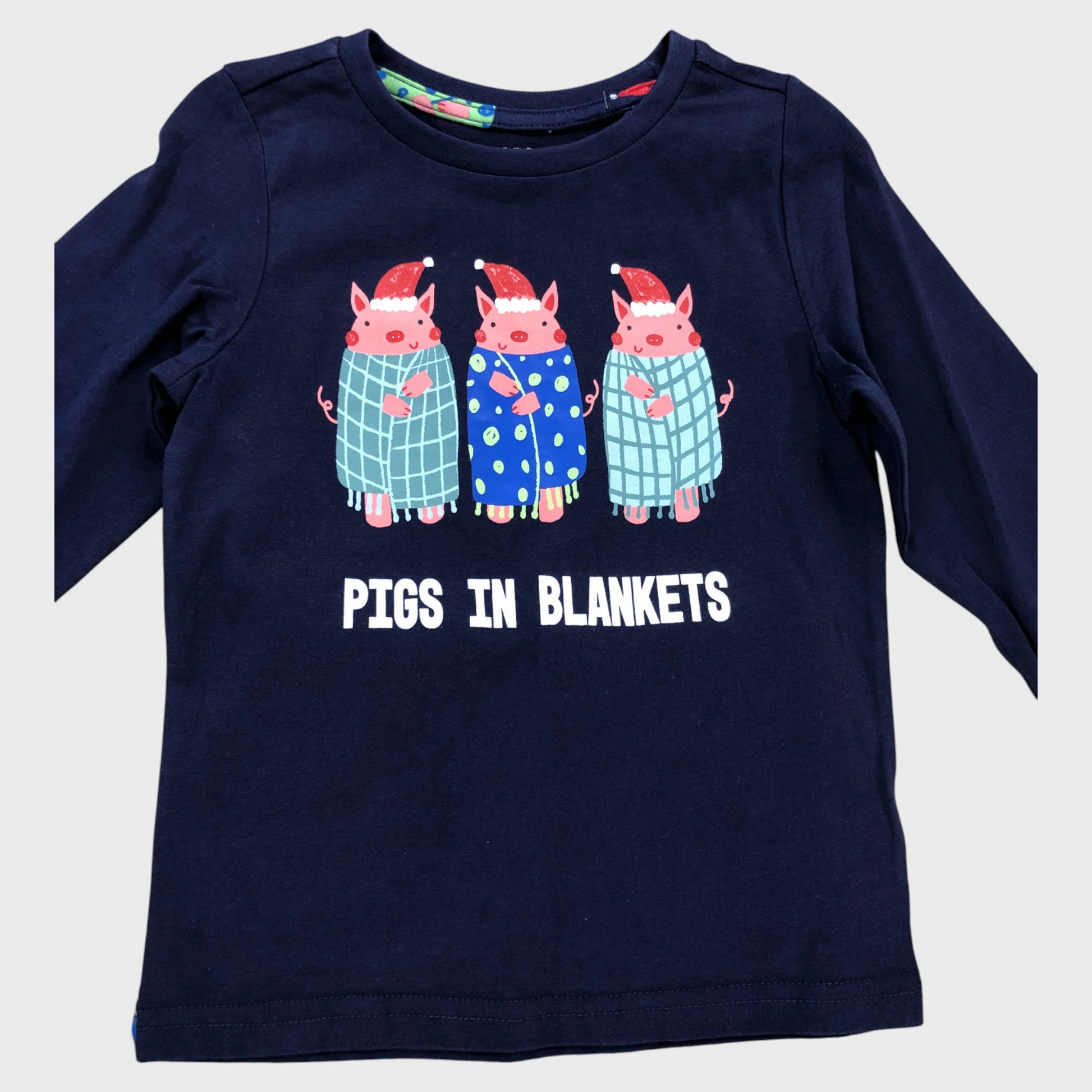 This unisex kids' pyjama set features a charming cartoon print of "Pigs in Blankets," perfect for bringing fun to bedtime. Designed with long sleeves, it offers comfortable warmth during cooler nights. The playful pattern makes it an appealing choice for children, while the soft fabric ensures all-night cosiness and ease of movement. Ideal for restful sleep and relaxed evenings at home.