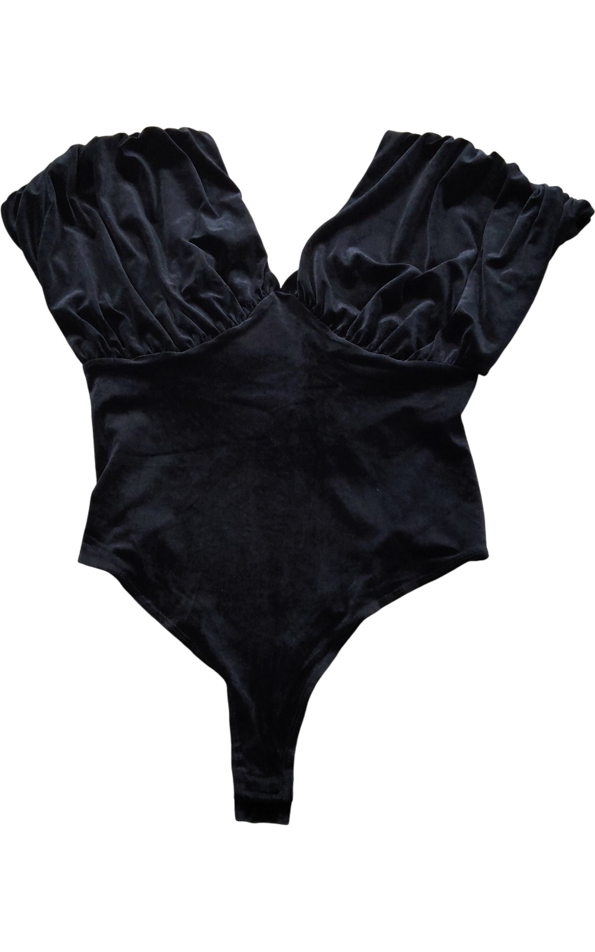River Island Black Velvet Bodysuit UK12 Women's Puff Sleeve Sexy Top