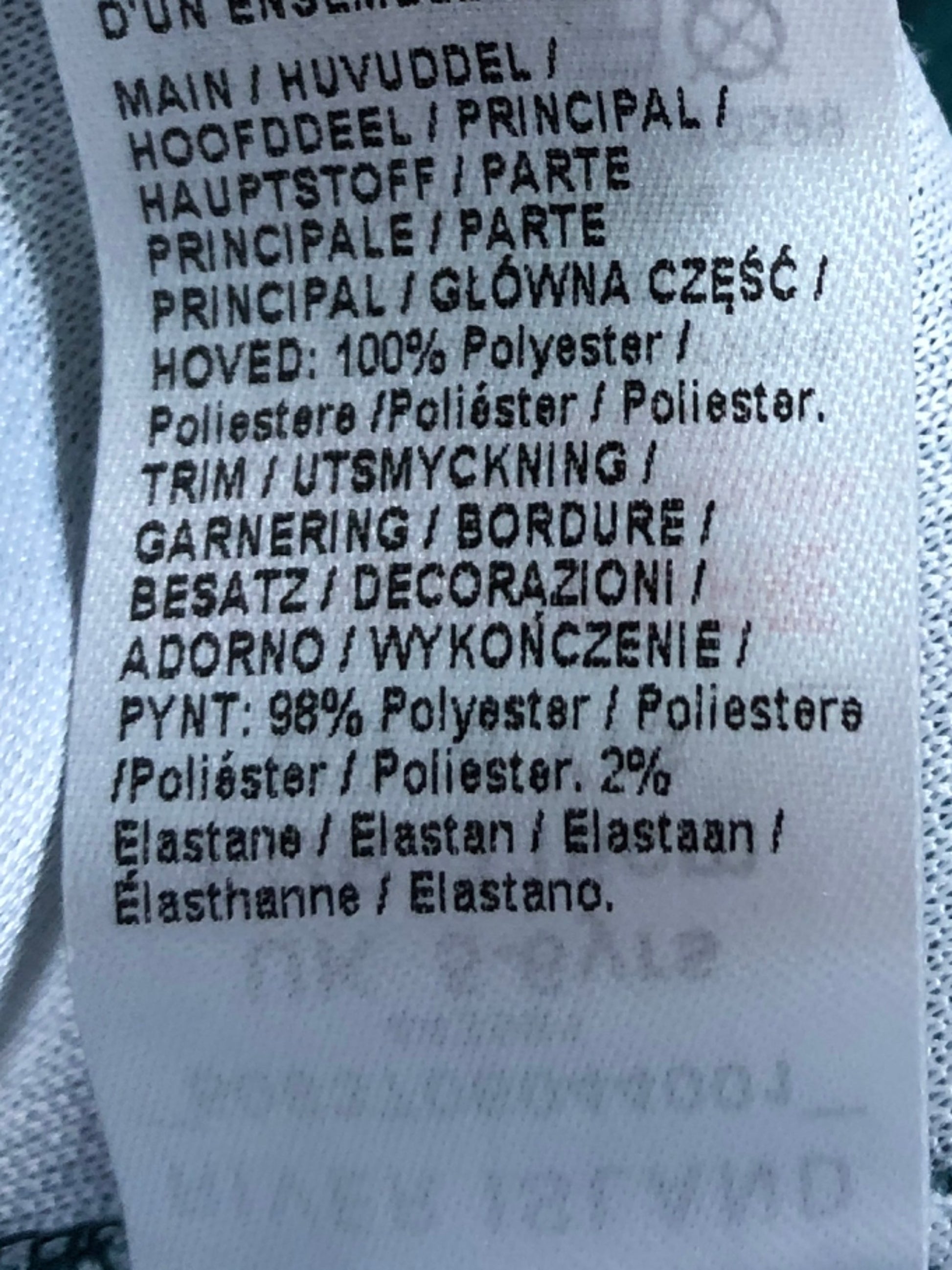 100% Polyester (main), 98% Polyester, 2% Elastane (trim)