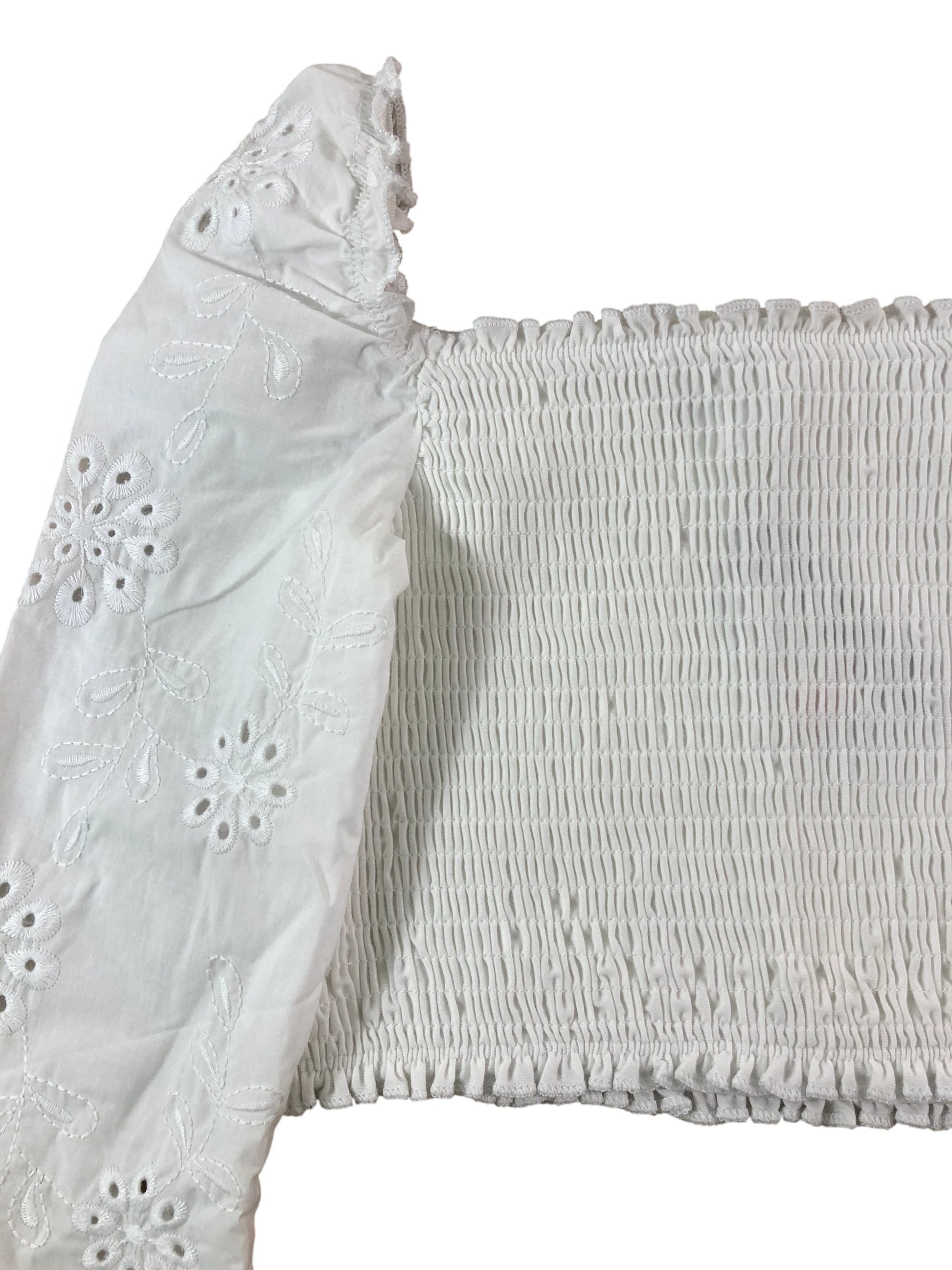 RIVER ISLAND Girls White Smocked Top UK7-8 Years Floral Embroidery Long Sleeve