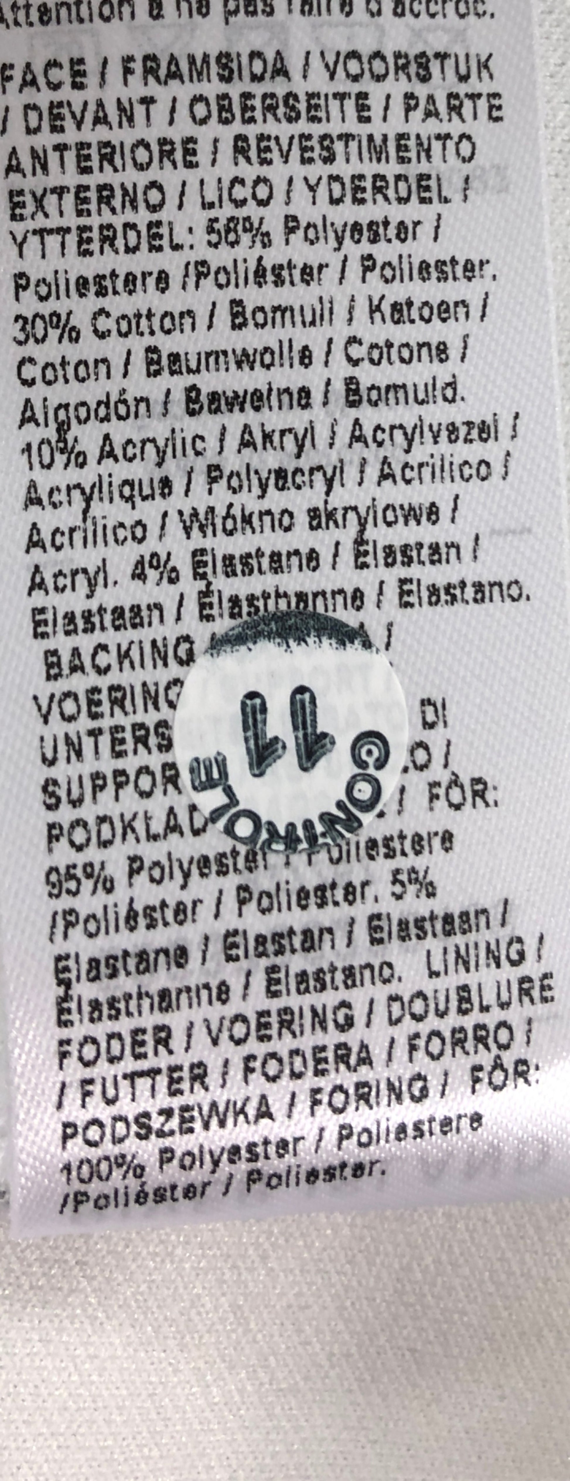 58% Polyester, 30% Cotton, 10% Acrylic, 4% Elastane