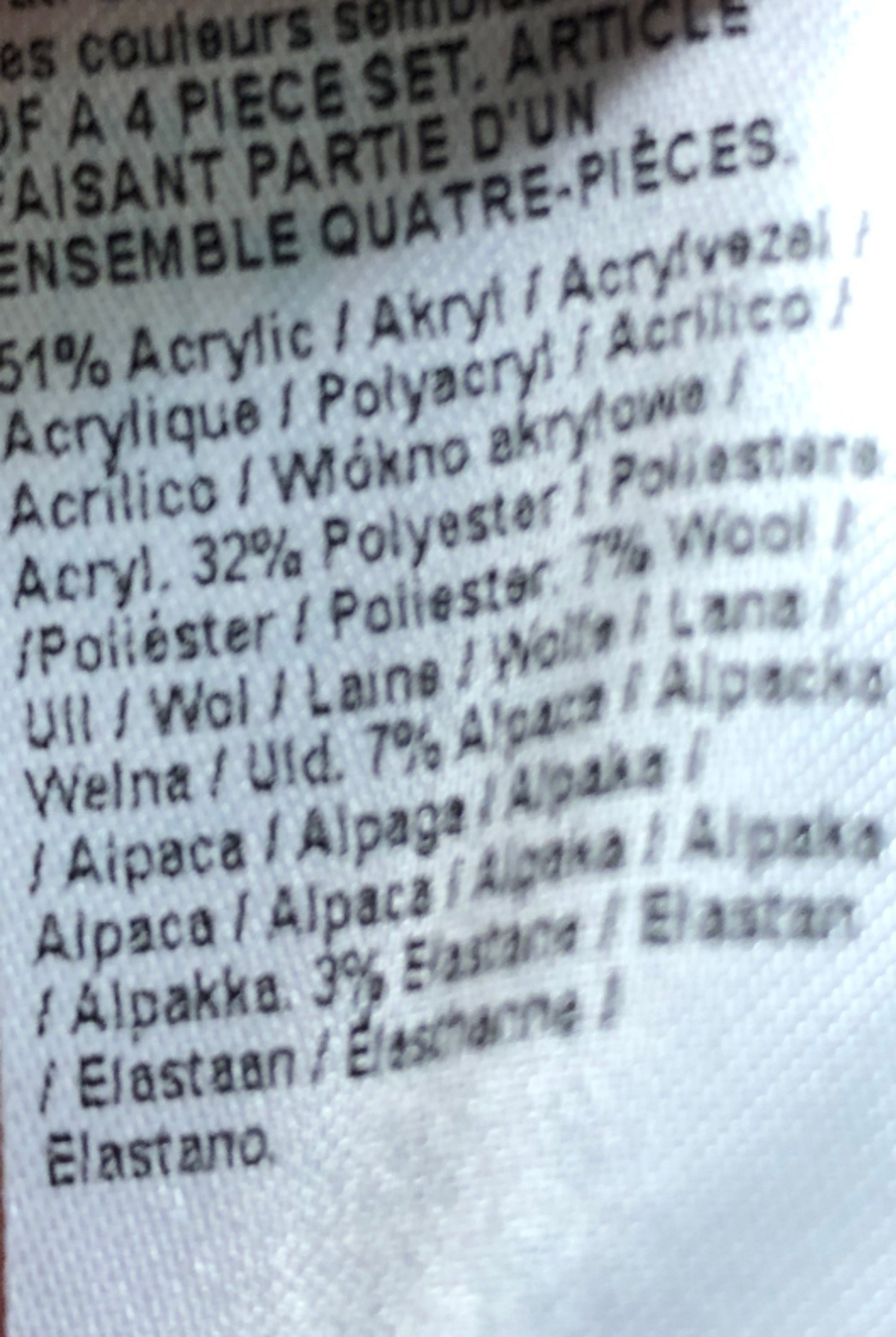 51% Acrylic, 26% Polyester, 17% Wool, 3% Alpaca, 3% Elastane