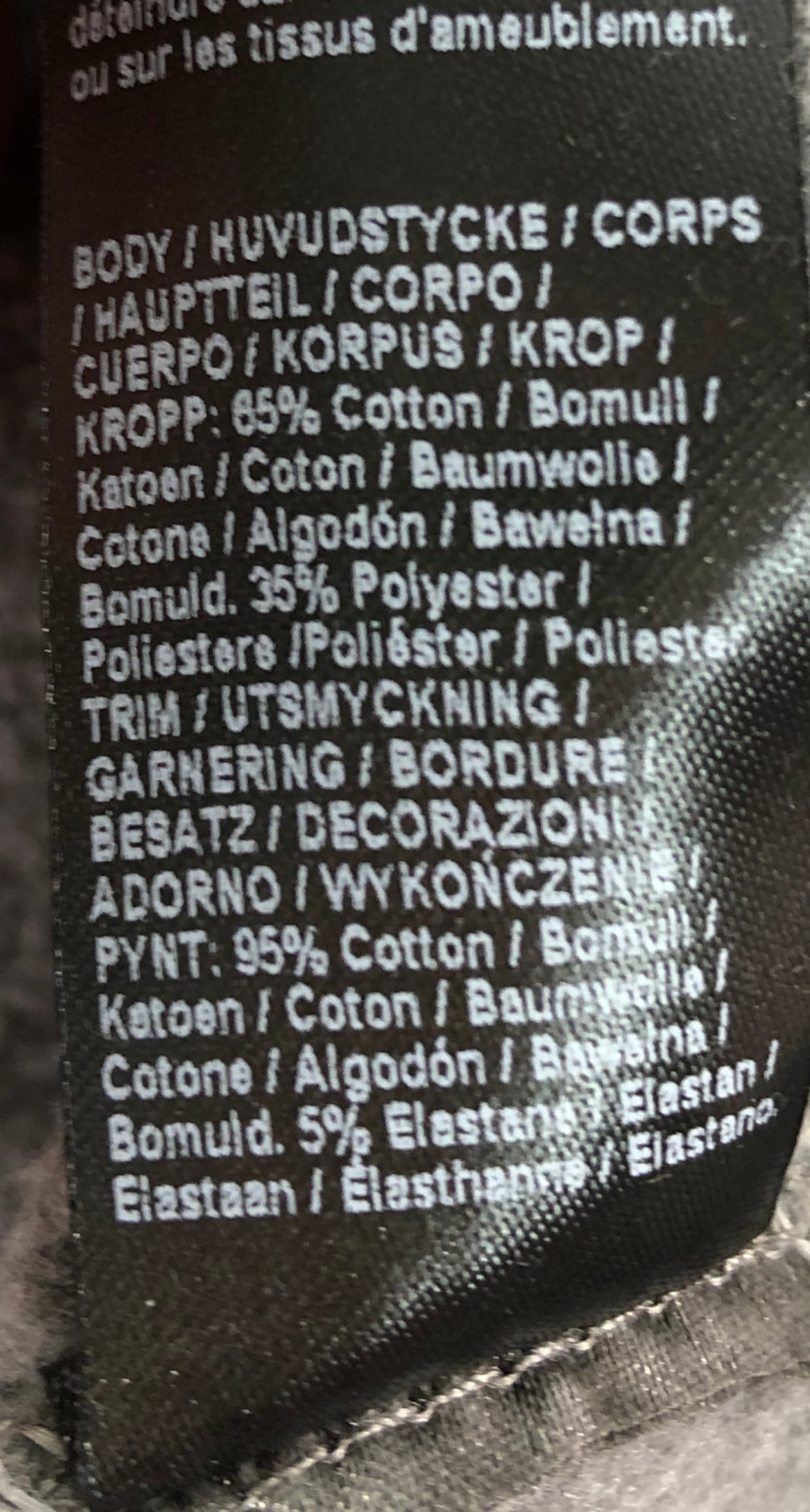 65% Cotton, 35% Polyester, 95% Cotton, 5% Elastane