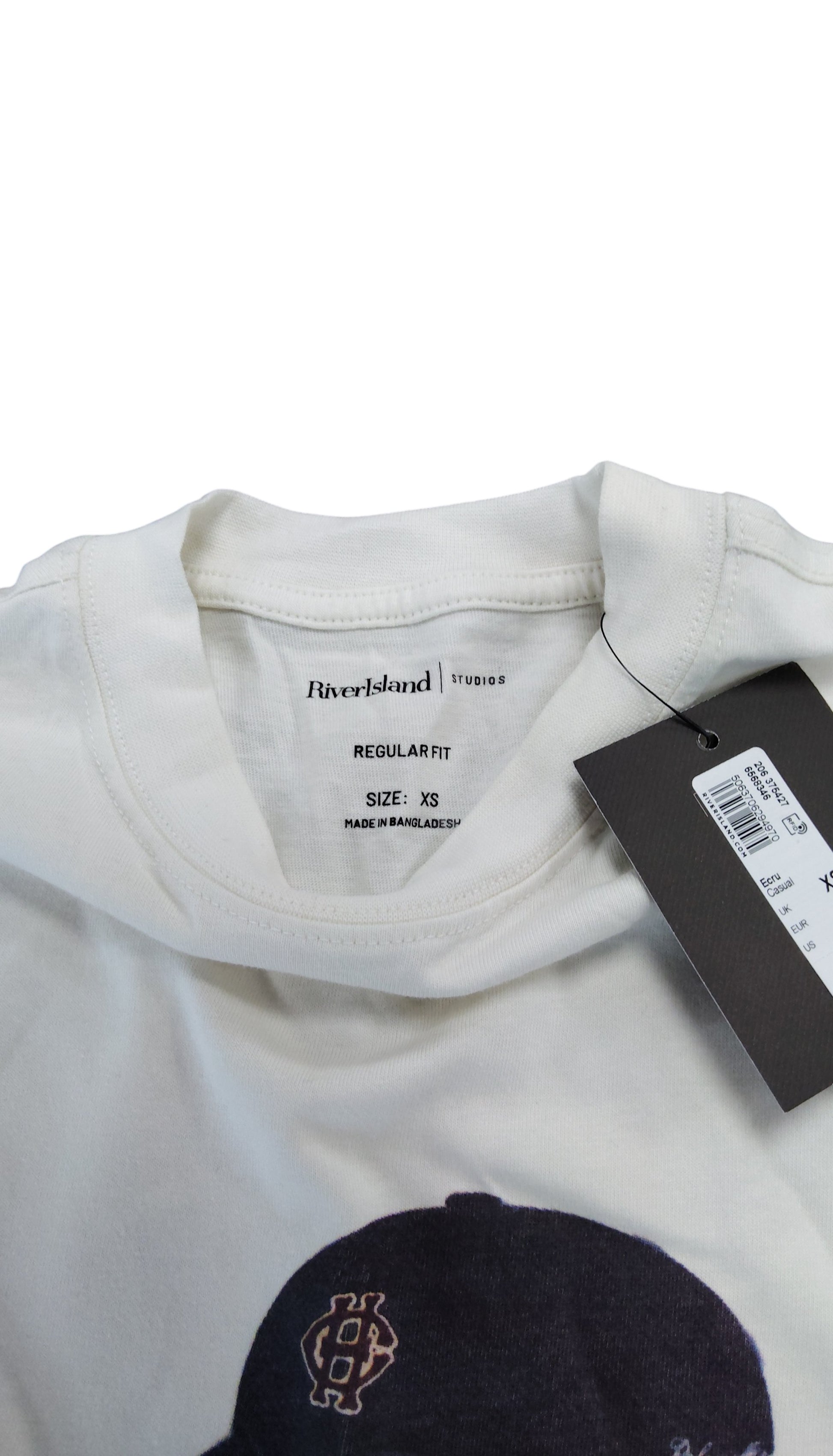 River Island Studios Dog Print T Shirt XS Casual White Cotton Short Sleeve