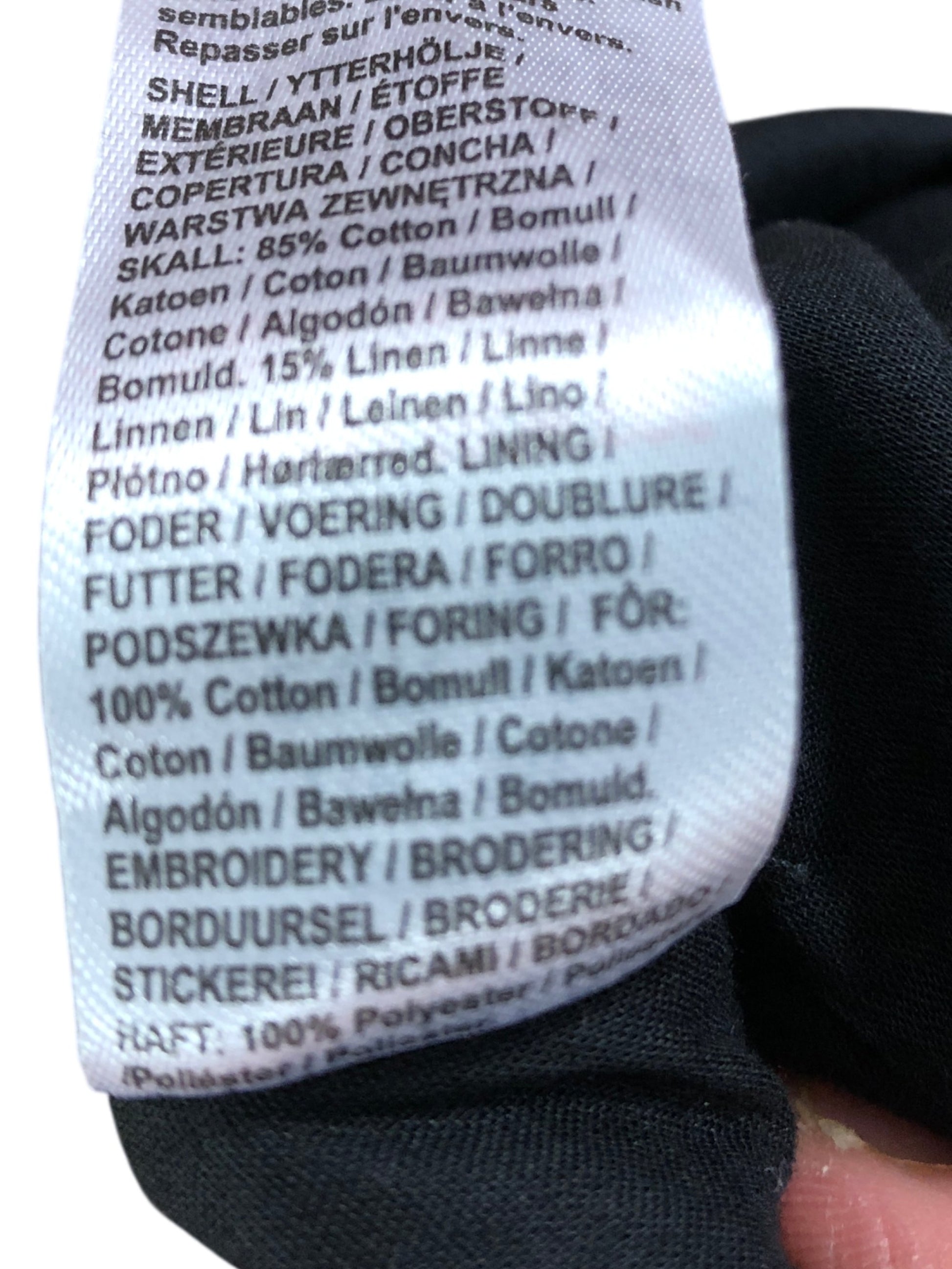 85% Cotton, 15% Linen. Embroidery: 100% Polyester