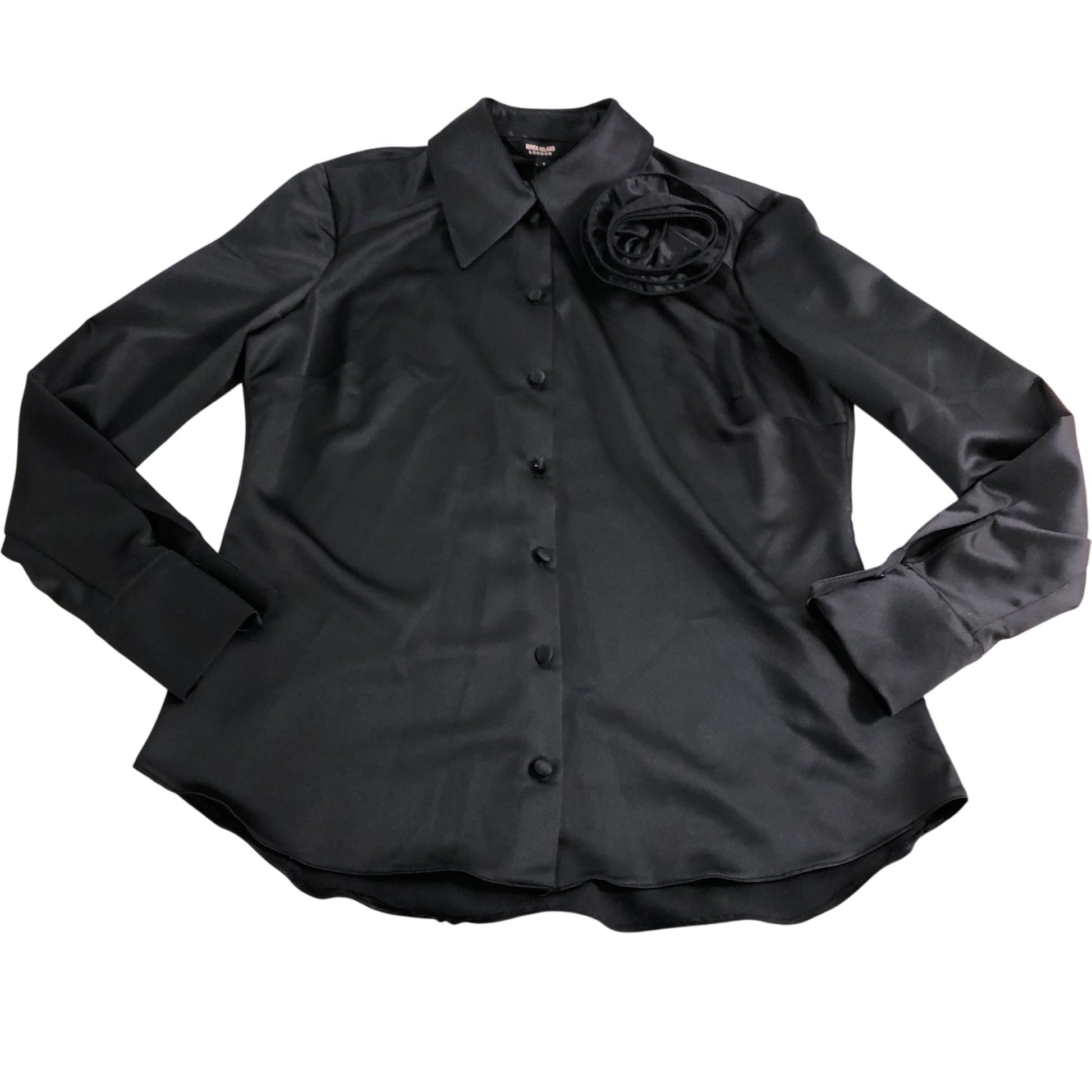 River Island Women's Black Satin Button Front Shirt With Flower Detail Size 6