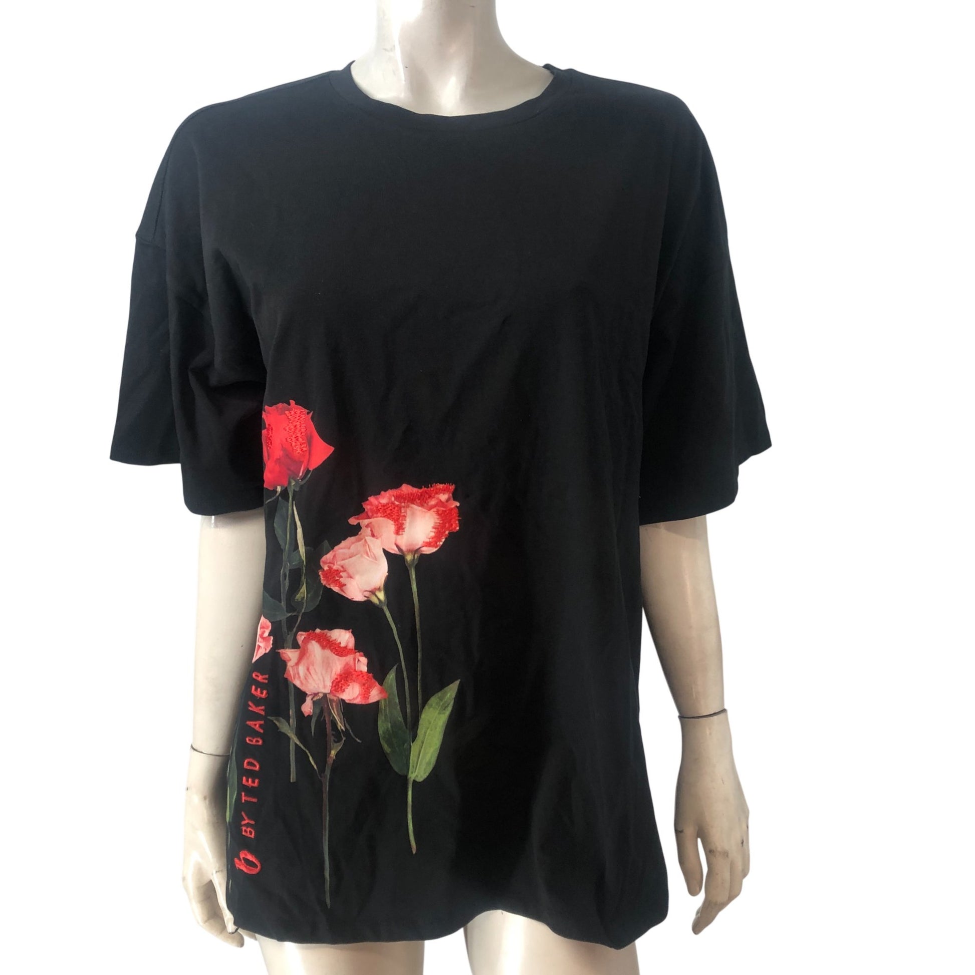 Ted Baker Floral Print T-Shirt UK12 Women's Black Cotton Short Sleeve Top