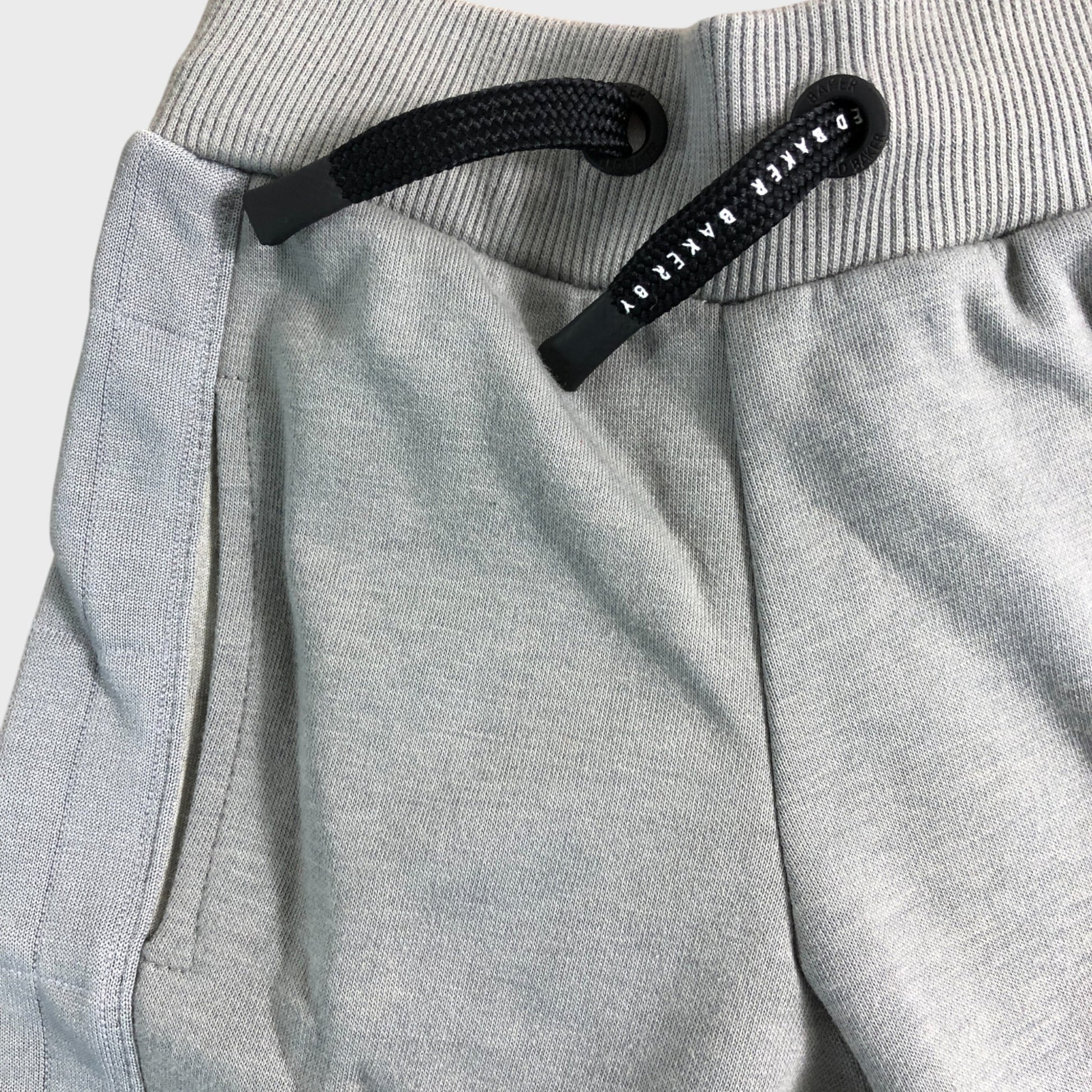 Grey joggers with elasticated drawstring waistband and pockets.