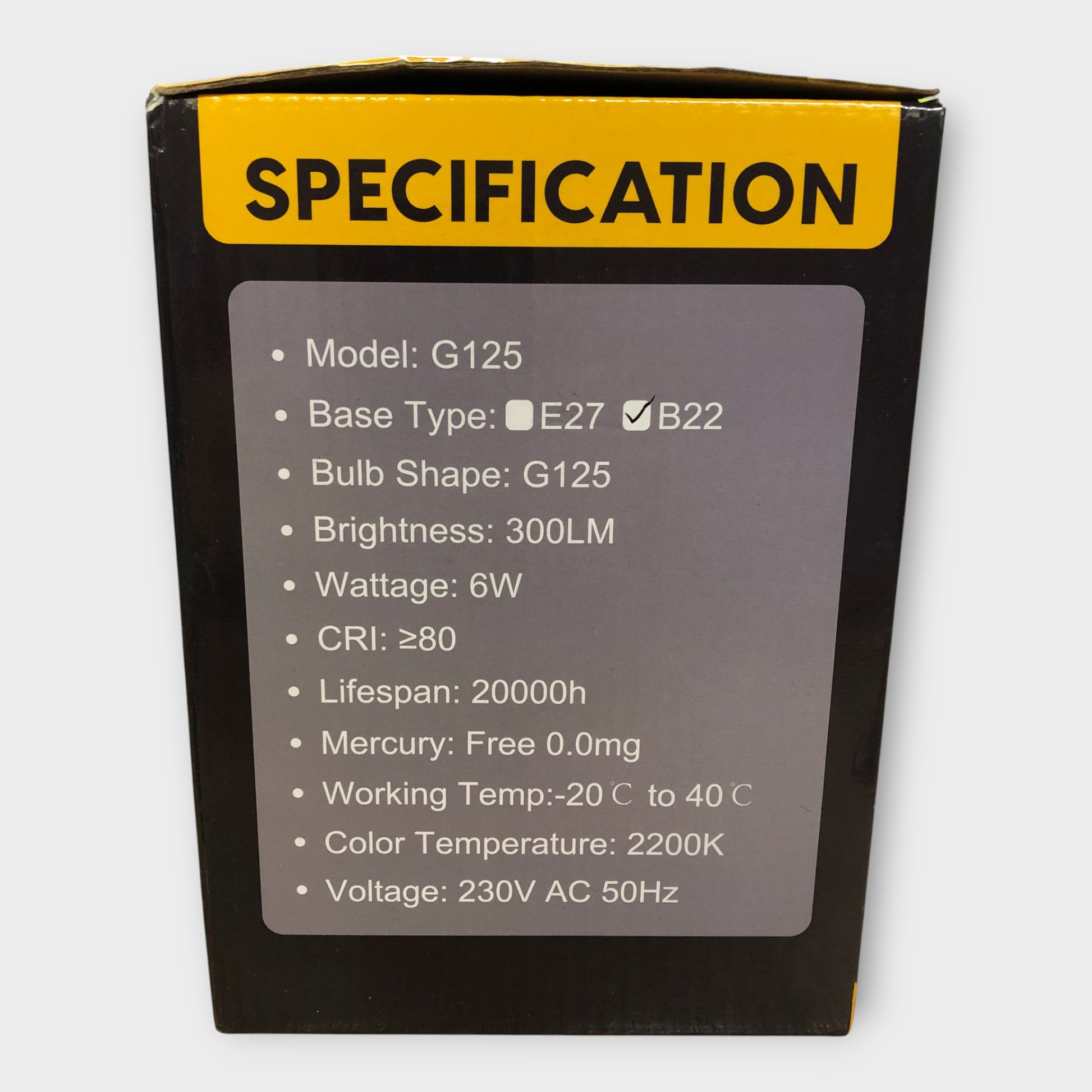This vintage Edison large light bulb emits a warm white glow and is designed with a B22 base, consuming 6W of power at 230 volts.