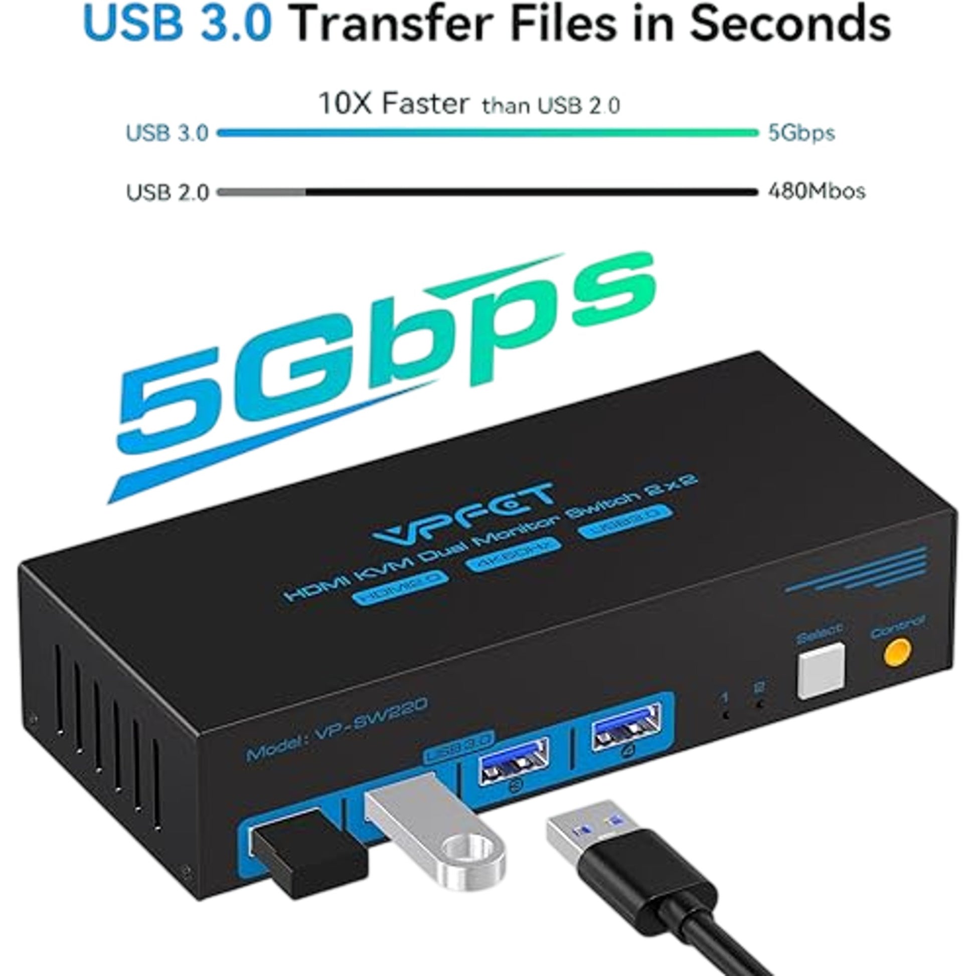 VPFET HDMI KVM Dual Monitor Switch Model VP-SW220 USB 3.0 2 Port Splitter